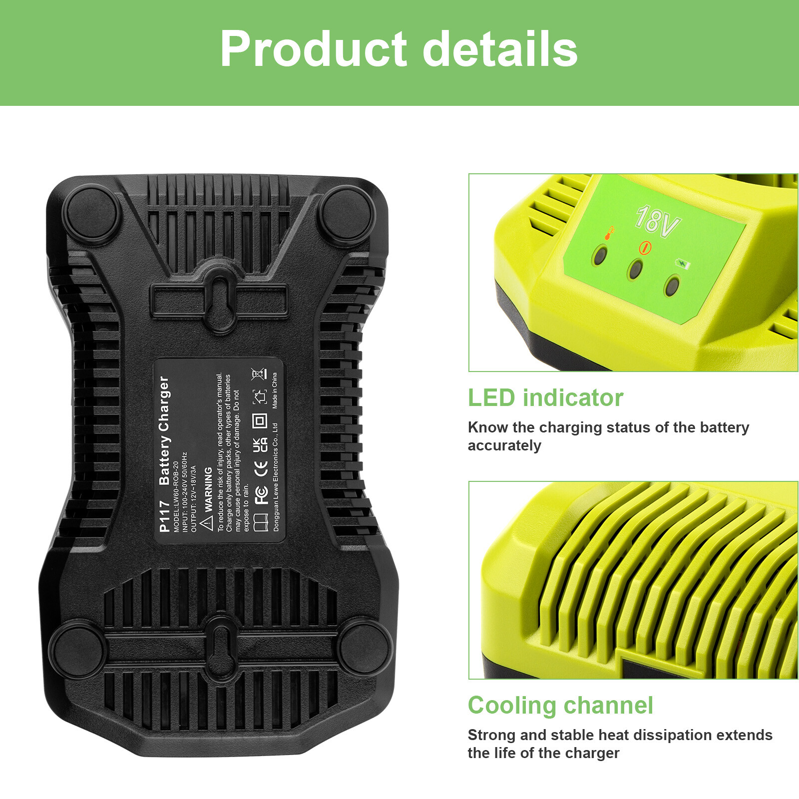 Ebay Final Template Description Specifications: 1.Type: Replacement P117 Battery charger with USB (No Battery Included) 2.Input: 100V--240V 3.Output Volt: 12V--18V 4.Output Current: Li-ion 3A, Ni-CD/Ni-MH 2A 5.Efficiency: 85W 6.Warranty: 10 years warranty and 60 days money back Compatible with: For Ryobi 12V-18V Lithium-Ion & Ni-Cd NIMh Batteries Compatible with Battery Model: Ryobi 12V NiCad Battery: 1400143, 1400652, 1400652B, 1400670, 4400005, B-8286, BPT1025, RY-1204 Ryobi 18V Lithium Battery: BPL-1815, BPL-1820G, BPL18151, BPL1820, P102, P103, P104, P105, P106, P107, P108, P109, P122, P161, P162, P164, P189, P190, P191, P192, P193, P194, P197 Ryobi 18V NiMh Battery: 130224028, 130224007, 130255004, ABP1801, ABP1803, BCP1817/2SM, BPP- 1813, BPP-1815, BPP-1817, BPP-1817/2, BPP-1817M, BPP-1820 Ryobi 18V NiCad Battery: P100, ABP1803, BPP-1813, BPP-1815, BPP-1817, BPP-1817/2, BPP-1817M, BPP-1820, BPP1817M Multi-Protections: 1.Overheat protection: stop charging when overheat. 2.Overcharge protection: stop charging when charging too much. 3.Short-circuit protection: charger Auto Cut off when Short-circuit. 4.Stop charging when charger faulty detected. Package Includeds: 1X For RYOBI P108 18V One+ Plus High Capacity Lithium-Ion Battery Charger with USB 1X User Manual NOTE: 1. The battery must be FULLY charged before first use. 2. The battery is stored in a cool and dry place. 3. Do not Separation, extrusion, and impact. 4. Do not put battery into water and fire. 5. Keep away from children. After-sale Service: 60 days money back + 10 years limited warranty. Hassle-free friendly customer service through email. Any problems please contact us at any time before leaving a neutral or negative feedback. Many thanks for your support. Payment Shipping Policy Returns & Warranty About us Contact us Payment * We accept several payment methods, such as PayPal, credit card, mastercard. * If you choose buy it now, you will be required to pay immediately. * In order to receive the item as soon as possible, please pay within 24 hours after placing the order. Shipping Policy *We are not responsible for undeliverable address. We reserve the right to charge the shipping fee again for returned items due to wrong address. *Items are generally shipped out the next business day after your payment has been cleared (Sat. & Sun. excluded.) *Orders from the United States will all be shipped out via UPS/USPS. The shipment usually takes 2-6 business days( Saturday and Sunday excluded), if you need the item urgently, please contact us for detail before purchase. *Local pick up is not available. *Customers in Porto Rico, Alaska and Hawaii are recommended to contact us for shipping details (shipping cost&time) before placing an order. *NO International Shipping, including Canada. Returns & Warranty *This product has a 10-year warranty. *Our warranty does not extended to any products that are physically damaged or that are not under normal operating conditions as a result of misuse or improper installation on the buyer/user's part. *For all returned products, buyers MUST contact us for the returning address. *In all cases, buyers pay shipping fees at their own cost to return products for exchange or refund. We will be responsible for the postage of replacements. Refund will be made upon receipt of the returned item. About us *We focus on designing and manufacturing varieties of Power Tool batteries with high quality and competitive price.We will do our best to serve you! Contact us *We have always been trying our best to provide the best service and reliable products for every customer. Please contact us via eBay message or email to resolve the issue before leaving negative feedback. *Any problems pls contact us at any time before leaving a negative/neutral feedback. Many thanks to you. On Jul 28, 2022 at 00:52:40 PDT, seller added the following information: On Feb 17, 2025 at 19:43:00 PST, seller added the following information: