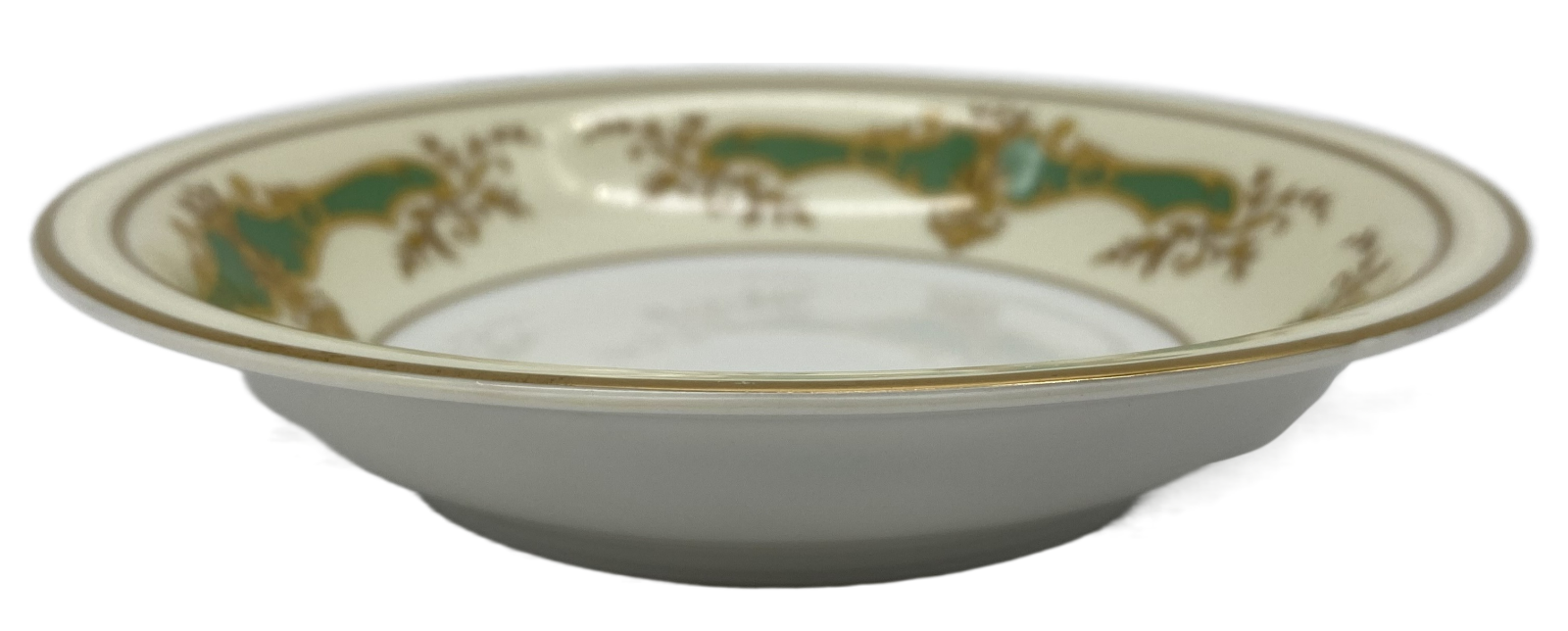 Manufacturer: Charles Ahrenfeldt Limoges Pattern: AHRUnk110 Product type: Fruit Bowl Colors: Green, Mustard, Gold Condition: Pre-owned. Very good without chips, cracks, crazing. Size: 1 " H & 5 3/4 " D