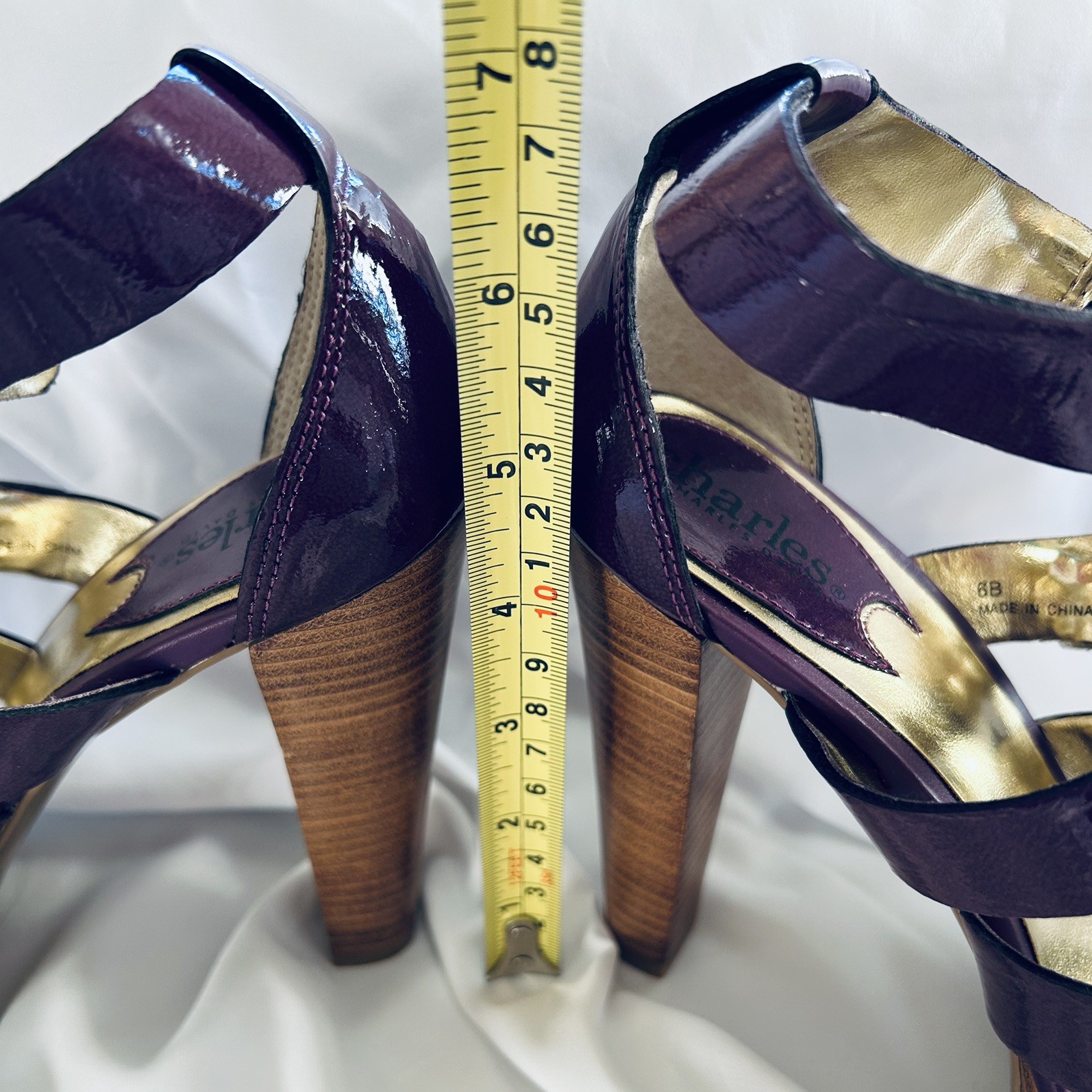 The Charles David Patent Leather Gladiator Sandal in size 6 is a stylish and trendy footwear option for women. With a stiletto heel and platform style, these sandals offer both fashion and comfort. The purple color and patent leather material add a touch of elegance to any outfit, making them a versatile choice for a night out or special occasion. Perfect for those looking to make a statement with their footwear, these sandals are a must-have for any woman's wardrobe.