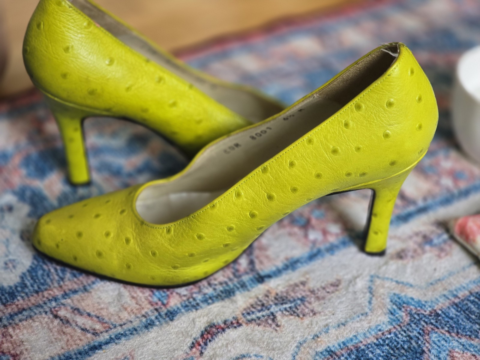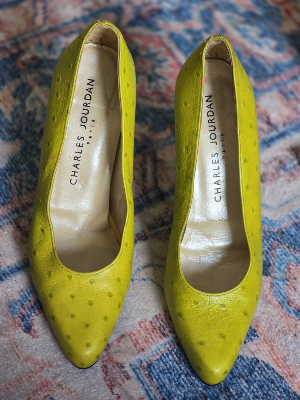 The Charles Jourdan Paris Women's Leather Pointed Toe Slip-On Heel in size 6.5 is a stylish and sophisticated shoe perfect for parties or cocktail events. Made with high-quality leather, these green heels feature a solid pattern and a slip-on closure for easy wear. With a vintage touch and a classic pump style, these French-made heels are designed to elevate any outfit with their timeless elegance. Perfect for summer, fall, and spring seasons, these shoes are a versatile addition to any woman's wardrobe.