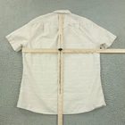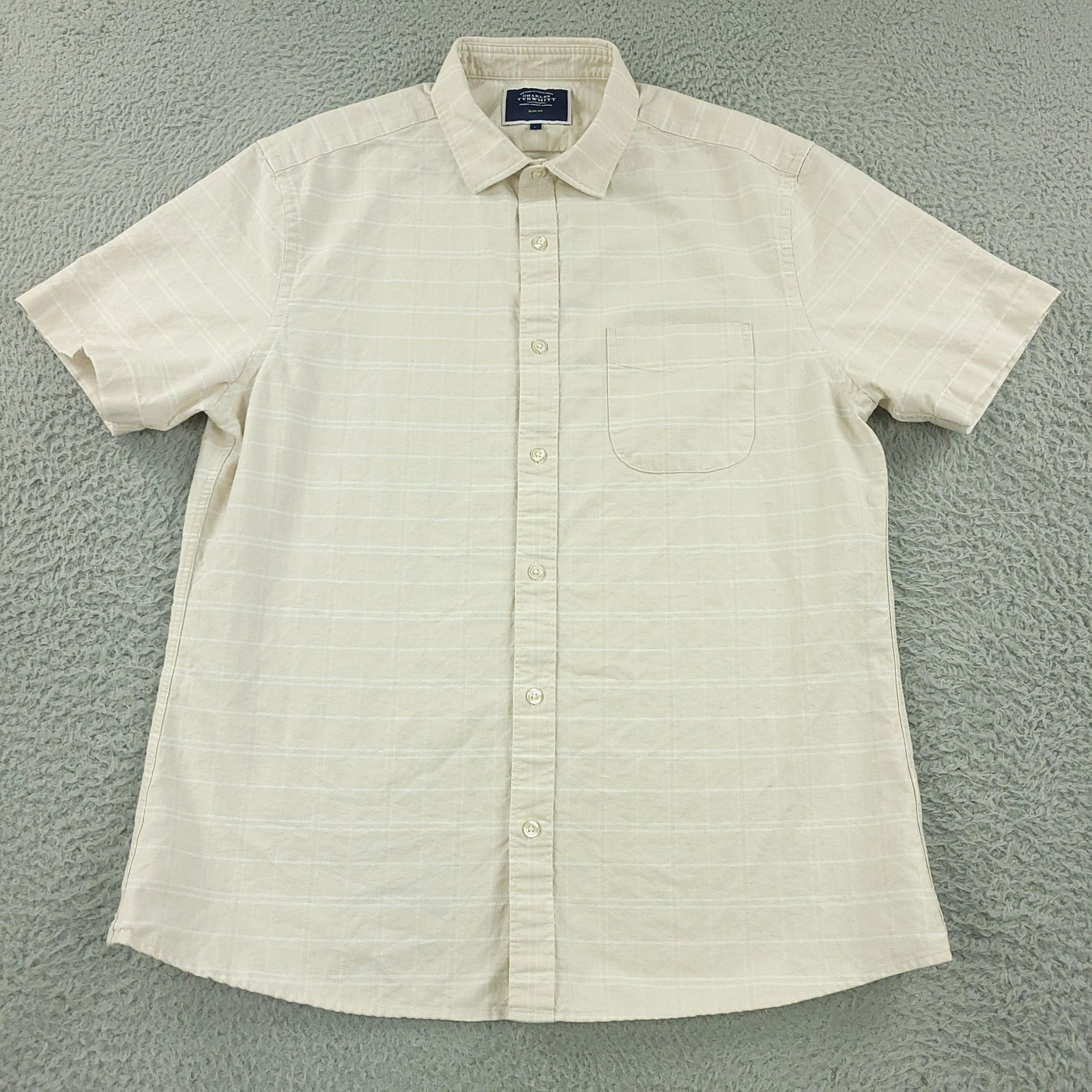 Brand: Charles Tyrwhitt Style: Mens short sleeve button front shirt with single chest pocket and subtle windowpane pattern. Color: Beige/cream with white check. Size on tag: Large (Slim Fit). Materials: 87% cotton, 13% linen (per care tag). Details: Point collar, lightweight breathable fabric, casual tailored slim silhouette, designed in London and made in Vietnam. Washed and dried with Fragrance Free Detergent & Dryer Sheets. Measurements are included in the photos, compare measurements with your item to ensure proper fit. (Measurements are done with the item lying flat). I ship next business day and all items include tracking. Items are added daily to my store