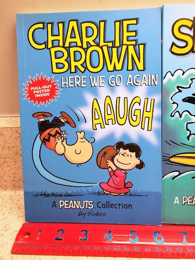 The product is a collection of three Peanuts comics featuring Charlie Brown, AAUGH 2016, Snoopy, Cowabunga 2013, and Woodstock, Master of Disguise 2015. The books are paperback comic books from AMP. suitable for young readers ages 9-12. Published by Andrews McMeel Publishing. the comics follow the adventures of the beloved Peanuts characters in a fun and entertaining narrative. Each book includes a pull out poster, and great for reading and collecting.