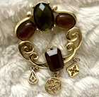 Charm Brooch Pin Jeweled Ornate Victorian Gold Plated Glass Cabochons Vintage Size: 2.5” x 1.75” Condition: Great pre-owned, vintage condition. See images.