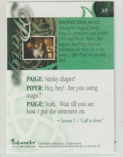 Genre: Adventure, Fantasy, Mystery, Romance, Supernatural, TV & Movies Character: Paige Set: Charmed Conversations Manufacturer: INKWORKS Card Size: Standard Features: Base Card Franchise: Charmed Language: English Autographed: No Theme: Trading Cards Type: Non-Sport Trading Card Graded: No Card Thickness: 20 Pt. Material: Card Stock TV Show: Charmed Featured Person/Artist: Rose McGowan Original/Licensed Reprint: Original Cast: Holly Marie Combs,Alyssa Milano