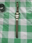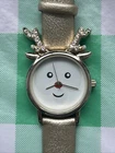 This watch is used and shows signs of wear. There is a crystal missing on the reindeer antlers as seen in the photos. Please ask any questions you may have and we will get back to you as soon as possible. New battery installed upon purchase