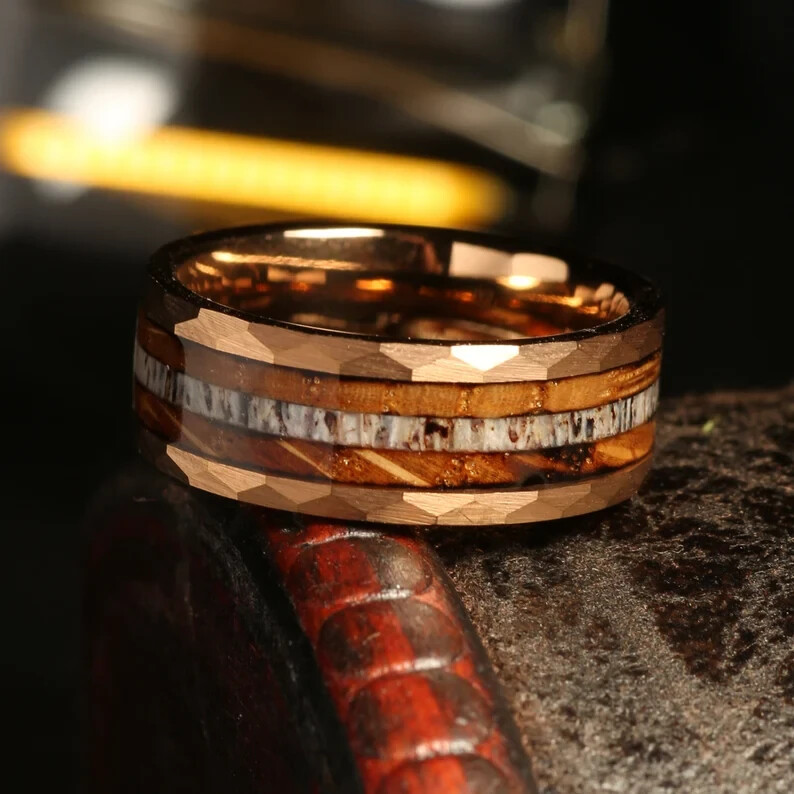 Deer Antler & Charred Whiskey Barrel Wood Ring, Rose Gold Tungsten, 8mm Comfort Fit Celebrate nature and craftsmanship with this striking wedding band, blending rugged charm and refined elegance. The hammered rose gold tungsten shell frames a unique inlay of naturally shed deer antler and charred whiskey barrel wood, creating a ring as distinctive as your love story. Handcrafted for durability and comfort, each ring is one of a kind — a perfect symbol of lasting commitment. To complete the experience, each Napoleonbands ring is elegantly presented in a premium, artisan-crafted wooden box , complete with personalized laser engraving : https://www.ebay.com/itm/405600082986 For those seeking an elevated presentation, you can upgrade upon request to our luxurious, handcrafted koa wooden ring box — a true statement of craftsmanship and distinction: https://www.ebay.com/itm/405948705902 Product Details: Material: Genuine Tungsten Carbide Inlay: Deer Antler & Charred Whiskey Barrel Wood Finish: Hammered Texture Color: Rose Gold Tungsten Fit: Comfort Fit Band Width: 8mm Sizing: True to Size Shipping: We offer free shipping within the U.S. Returns: If your ring is not engraved, you’re welcome to return or exchange it—just reach out to us. If your ring is engraved, we’re unable to accept returns. However, if there’s an error on our part with the engraving, we’ll make it right. Why Choose This Ring: Naturally Unique: The use of genuine antler and wood means no two rings are alike — each piece tells its own story. Built to Endure: Crafted from ultra-durable tungsten carbide, this band is scratch-resistant and perfect for everyday wear. Comfortable All-Day Wear: The comfort-fit design ensures a smooth, easy feel, whether you’re at work or celebrating a special occasion. Hypoallergenic & Skin-Safe: Ideal for sensitive skin, so you can wear it worry-free. Premium Presentation: Every ring comes in a handcrafted antiqued rosewood box, ready for gifting. Embrace the wild. Shop now and wear a piece of nature’s beauty every day.