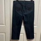 Get ready to rock your fashion game with these Charter Club Women's Jeans in a medium blue wash. These jeans feature a flattering mid-rise fit with a modern straight cut and a cropped length that is perfect for any season. The 5-pocket design includes a zip and button closure for easy wear, while the studded, embroidered, and button accents add a touch of personality. Made from a comfortable and breathable cotton blend with a dark wash, these jeans are easy to care for and also have shaping and stretch features for a flattering fit. Complete with a belted waist and a solid pattern, these jeans are a classic and versatile addition to any wardrobe. Don't miss out on this must-have piece from the Charter Club line. very Light faded Otherwise very good pre owned condition 75% cotton 23% polyester 2% spandex stretch denim machine washable 36’ around waist inside button 43’ around hips 11.50’ front rise 25’ leg inseam 16’ around leg bottom nice for Spring and Summer