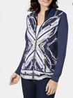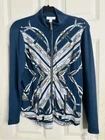 Charter club NWT Slate Blue Equestrian Print Zip Up Jacket Size Petite Medium - lightweight jacket - Slate blue/grey with grey/white/gold belt/horse bit pattern across the front - 2 front pockets - Gold zippers - 92% nylon, 8% spandex Pit 19 Length 22