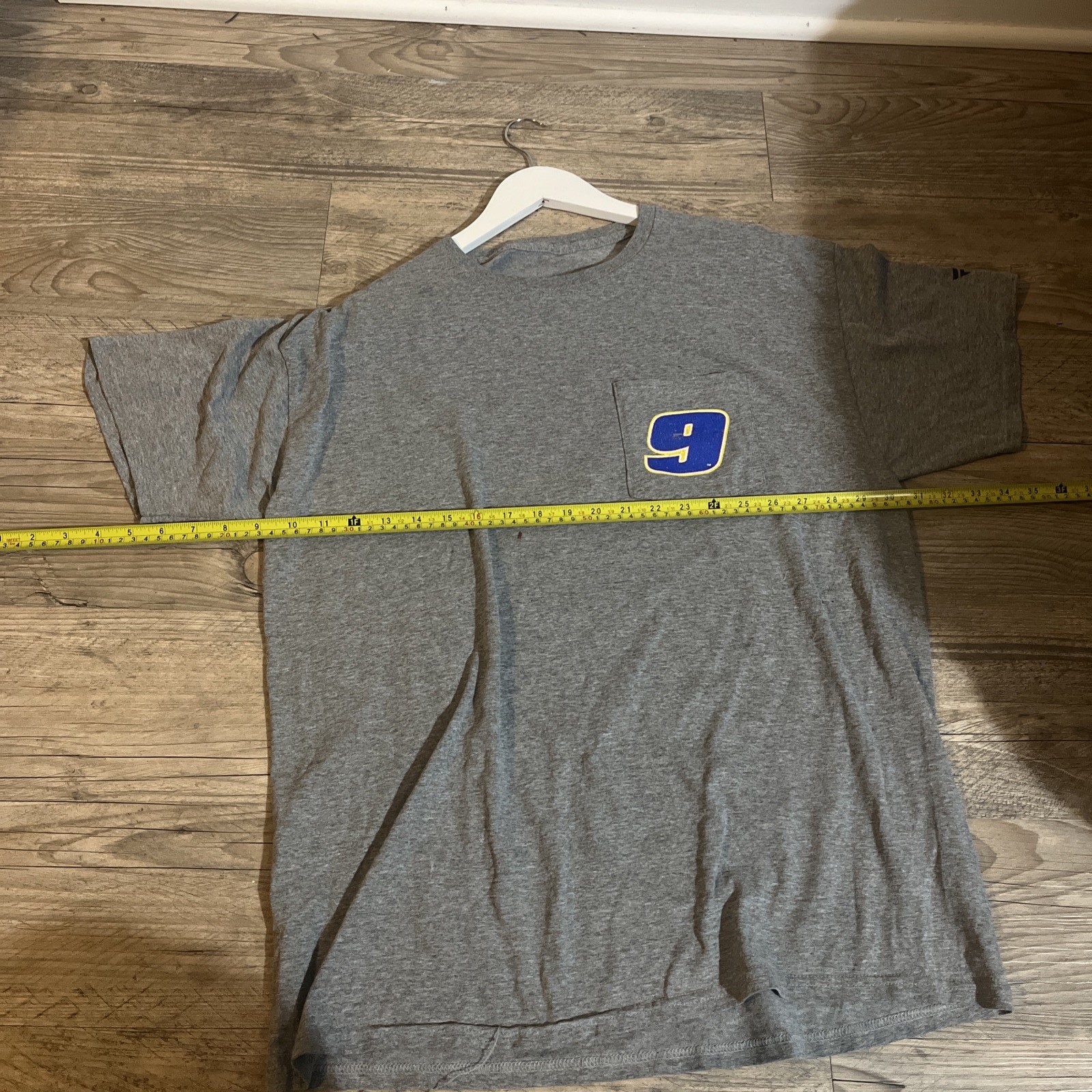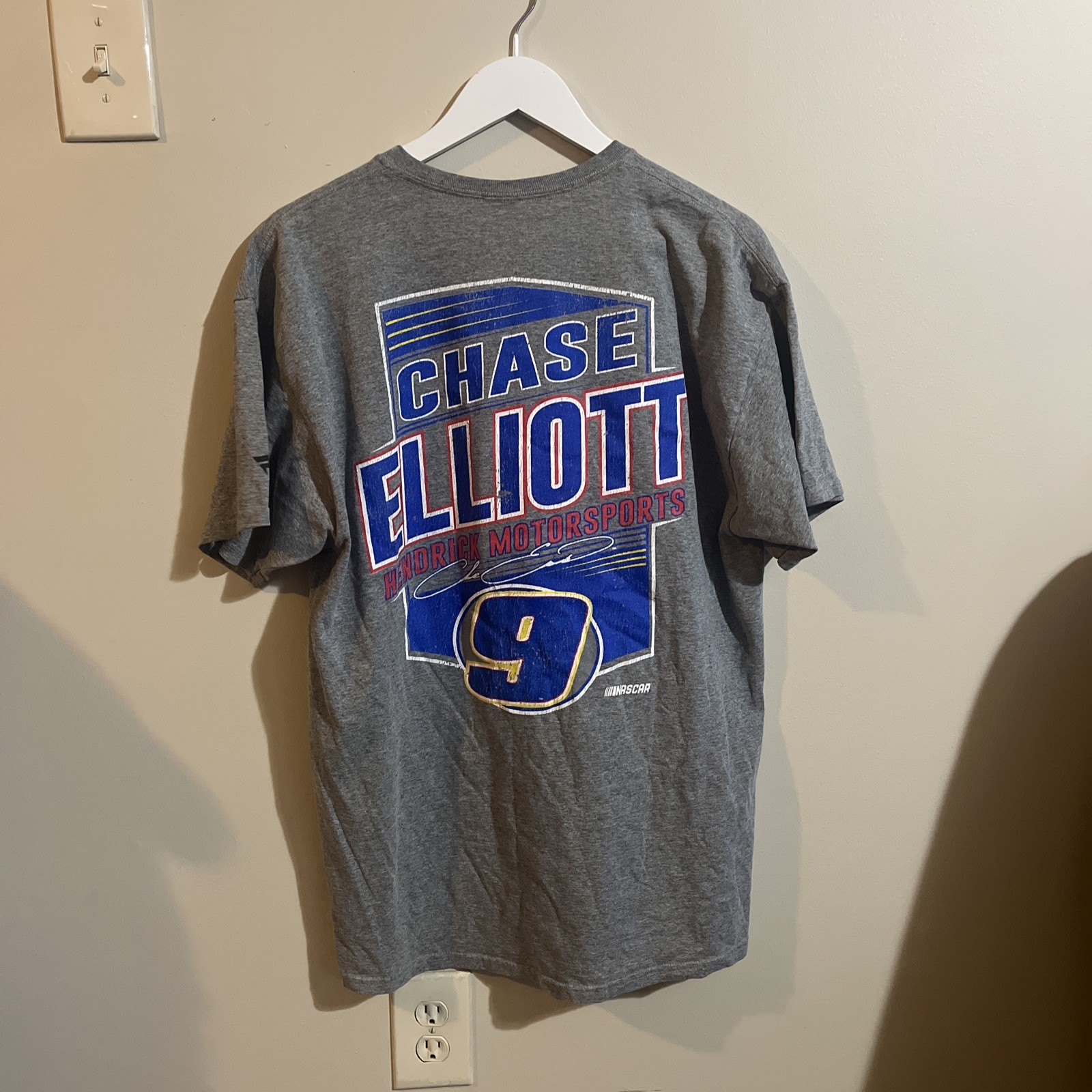 The product is an XL Chase Elliott NASCAR #9 Fanatics T-shirt in gray. This shirt represents the auto racing sport of NASCAR and features the driver Chase Elliott, who drives the #9 car for Hendrick Motorsports. With its high-quality construction and design, this shirt is a must-have for any fan of Chase Elliott or NASCAR in general. It allows fans to show their support for their favorite driver and team while staying comfortable and stylish.