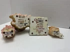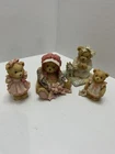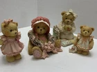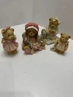 This is a set of four Cherished Teddies bear figures, each one depicting a girl in different outfits. They are all original and come from the Cherished Teddies collection. The bears are miniatures and are perfect for any occasion, whether as a gift for a loved one or as a decorative item. Each figure is multicolored and signed. They are not antiques, but are vintage and have been well-preserved. This set is ideal for collectors and fans of the Cherished Teddies franchise. All come in a box.