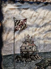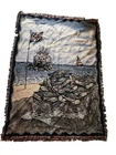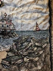 This woven tapestry blanket features a nautical scene from Chesapeake Bay, showcasing a lighthouse, flag, crabs, and sailboat. Designed to add a maritime charm to your space, it can be used as a decorative throw or wall hanging. • Woven tapestry fabric • Nautical lighthouse design • Fringed edges • Versatile use as throw or wall decor