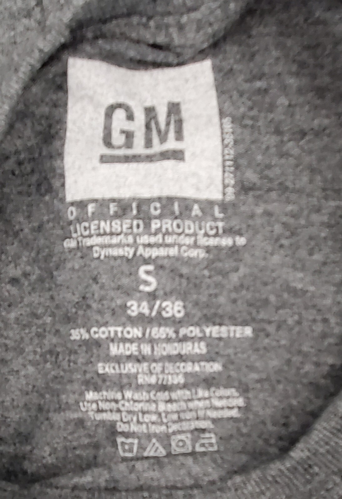 General Motors Chevrolet All American Genuine Parts Men's Size Small Great. It's a dark blue gray color that is made of 35% cotton and 65% polyester. Please check measurements as preowned item measurements may vary. The measurement across the chest laying flat is 18 1/2 inches and the length from the shoulder to the bottom is 25 1/2 inches. If you have any questions, please ask before you purchase and I do combine shipping.