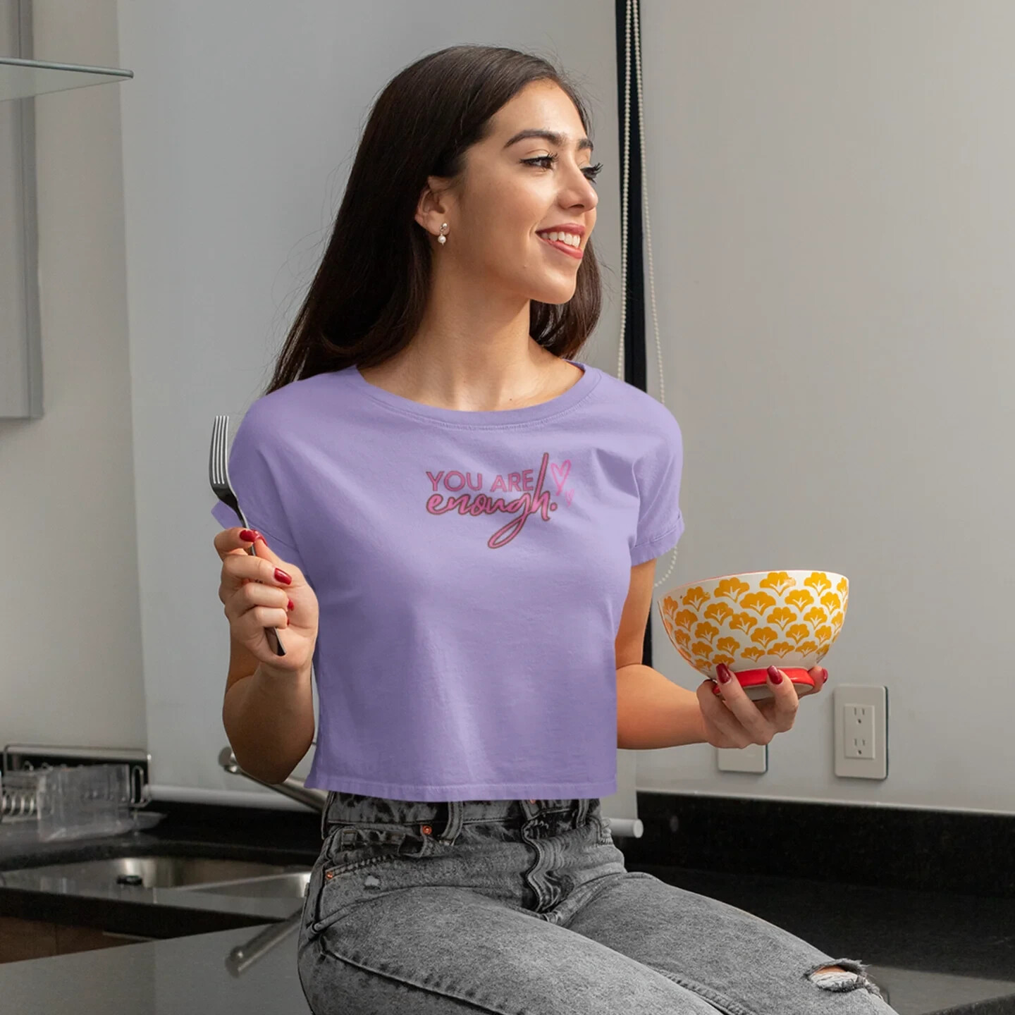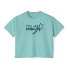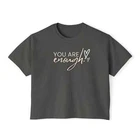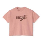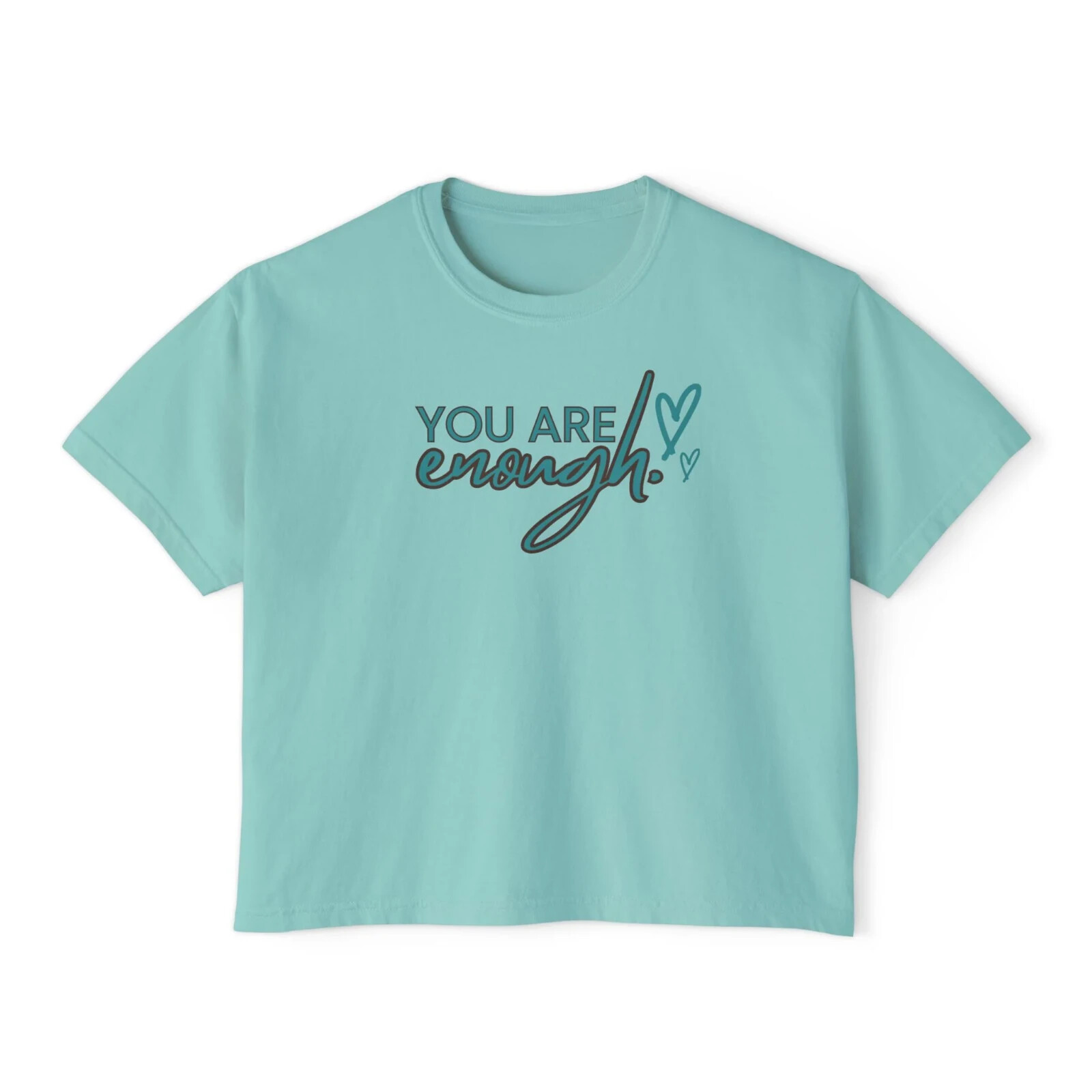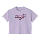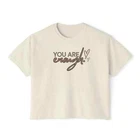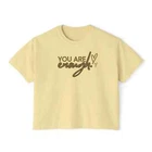 Description This Women’s Text Printed Boxy Fit Round Neck Oversized Look Cropped Tee is the epitome of casual chic, seamlessly blending comfort with style. Crafted from soft, breathable fabric, this tee offers a relaxed fit that drapes beautifully on any body type, ensuring all-day comfort without sacrificing fashion. The boxy silhouette paired with a round neck design provides a contemporary edge, making it a versatile addition to any wardrobe. The text print adds a touch of personality and flair, perfect for expressing your unique style. Its oversized look is both trendy and practical, allowing for easy layering over tanks or under jackets. With its cropped length, this tee pairs effortlessly with high-waisted jeans, skirts, or shorts for a balanced, fashion-forward ensemble. Whether you’re lounging at home, heading out for a casual day, or meeting friends for coffee, this tee is designed to offer a relaxed yet polished look. Available in a variety of colors, it’s an essential piece that complements any casual wardrobe. Overview: This women's oversized boxy t-shirt brings ample comfort and a laidback style that feels right at home on any occasion. With its 100% ring-spun cotton fabric, it feels soft, while the boxy fit with the slightly cropped, seamless body adds that signature oversized look. This shirt is made with ethically and sustainably sourced cotton while the OEKO TEX-certified dyes mean all your prints come alive with eco-friendly, vibrant colors that last and are salt-free. Pigment dyes provide a vintage look that will remain for the life of the garment. Fabric: 100% ring-spun cotton Heavy fabric (6.1 oz/yd² (206.8 g/m²)) Fit: The shirt has a boxy fit and has a slightly cropped seamless body. Twill tape covers the shoulder and neck seams to stabilize the back of the shirt and prevent stretching.