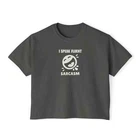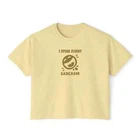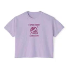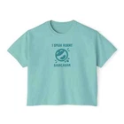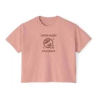 Description Introducing our Women’s Humor Text Printed Boxy Fit Cropped Tee, designed for those who love to express their personality with a touch of wit. This cropped tee offers a relaxed, boxy fit that provides both comfort and style, making it a versatile addition to any wardrobe. Crafted from soft, breathable fabric, it ensures all-day comfort, whether you're lounging at home or out with friends. The short sleeves add to its casual vibe, while the clever humor text printed on the front brings a playful edge. Pair it with your favorite jeans or shorts for a laid-back, trendy look that showcases your unique sense of humor. Perfect for casual outings or as a statement piece, this tee is a must-have for any woman who enjoys a blend of comfort and style. Overview: This women's oversized boxy t-shirt brings ample comfort and a laidback style that feels right at home on any occasion. With its 100% ring-spun cotton fabric, it feels soft, while the boxy fit with the slightly cropped, seamless body adds that signature oversized look. This shirt is made with ethically and sustainably sourced cotton while the OEKO TEX-certified dyes mean all your prints come alive with eco-friendly, vibrant colors that last and are salt-free. Pigment dyes provide a vintage look that will remain for the life of the garment. Fabric: 100% ring-spun cotton Heavy fabric (6.1 oz/yd² (206.8 g/m²)) Fit: The shirt has a boxy fit and has a slightly cropped seamless body. Twill tape covers the shoulder and neck seams to stabilize the back of the shirt and prevent stretching.