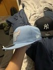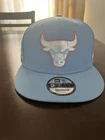 This is a pre-owned Chicago Bulls snapback hat in baby blue. It is designed by New Era and made of canvas fabric. The hat is one size fits all and features an adjustable snapback closure. It is suitable for casual occasions and has a sports theme, making it ideal for men's accessories.