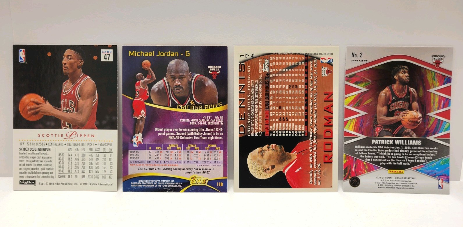 The product is a 4-card lot featuring legendary Chicago Bulls players Michael Jordan, Scott Pippen, Dennis Rodman and on modern card of PatrickWilliams. The cards are from various showcasing the players in their Bulls uniforms. These cards showcase the Chicago Bulls team in the 1990s, making them a coveted item for basketball card collectors and fans of the iconic team. Cards included are: 1993-94 Skybox Premium #47 Scottie Pippen 1997-98 Topps Sstadium Club #118 Michael Jordan 1996-97 Topps #176 Dennis Rodman 2020-21 Panini Mosaic #2 Patrick Williams Introductions Red Mosaic Cards will each ship within a penny sleeve and top loader for protection. As our team (father and son), the intent is to pass on an appreciation for the hobby. We hope you enjoy bidding on these great players and look forward to possibly adding it your collection. Best regards, Gengler Boys Sports Cards "a father and son hobby"