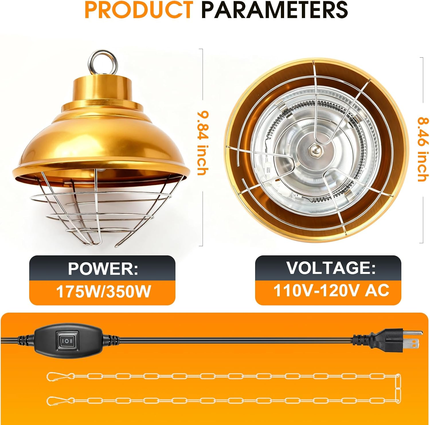 Chicken Heat Lamp 350W Chicken Coop Heater Carbon Fiber Bulb Two-Temperature Dual-Temp Modes & 350W High Efficiency: Features 350W high power and two heating modes (175W/350W) to provide just the right amount of warmth for different life stages and weather conditions, ensuring comfort while being energy-efficient. Premium Carbon Fiber Tube: The advanced carbon fiber heating tube heats up rapidly, provides even and stable heat distribution, and is more durable and shatter-resistant compared to traditional ceramic bulbs. Wide Application & Ideal Heating Solution: Perfect brooder heater for chicks, ducklings, and poultry. Also provides essential warmth for reptiles (lizards, turtles), and outdoor pet shelters like dog kennels and cat houses. Adjustable & Secure Design: Includes a sturdy metal guard and a flexible hanging chain. Easily adjust the height to achieve the perfect temperature gradient in your coop, terrarium, or pet space. Safety & Durability Assured: The built-in metal protective grill prevents direct contact, reducing fire and burn risks. The E26 standard base fits most fixtures. FMATOZ is committed to providing reliable heating solutions for your animals. Product description Material High Carbon Steel Specific Uses For Product Indoor Product Dimensions 9.44"L x 9.44"W x 7.08"H Included Components Chain, Lock, Product Manual, Stainless steel lampshade, chicken coop heater Complimentary Shipping and Easy Returns Need to return something? Enjoy our 30-day hassle-free return policy! Take advantage of free shipping across all 48 contiguous states! Your order will be dispatched within 1-2 business days once payment is confirmed. Your Opinion Matters! Your happiness is our main goal! We welcome your feedback! If you encounter any problems, reach out to us right away, and we’ll be here to help. Explore the Extraordinary! Our collection showcases fascinating products that are sure to capture your attention. What surprises await you? Delve in and discover unique items that enrich your daily life. Don't miss the amazing things we have in store for you!