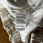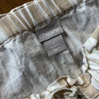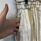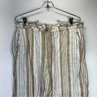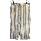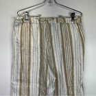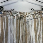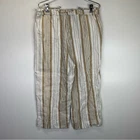 White and tan striped capri pants from Chico's. 100% linen. High rise, pull on style with a stretchy, drawstring waist. Relaxed fit, cropped below the knee. Slant pockets at the hips. Size 1, which equates to a small based on the Chico's size chart. Approximate measurements laid flat: 16" across waist 11.5" rise 19.5" inseam 10" ankle opening Casual, Comfy, Office, Business, Preppy, Chic, Minimalist, Trendy, Everyday, High Rise, Modern, Beach, Coastal, Boho