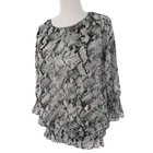 This blouse is as versatile as a chameleon at a fashion show. With its semi-sheer fabric and animal print, it effortlessly transitions from a professional setting to a weekend brunch. Perfect for those who want to feel wild and free while keeping it classy. • 3/4 length sleeves • Relaxed fit • Elastic hem • Scoop neckline • Semi - sheer • Split sleeves Features: • modern, classic, timeless, boho, bohemian, casual chic, versatile, semi-sheer, work wear, professional, date night, weekend, brunch, blouse, relaxed, animal print Size: Womens S Approximate Measurements: Length from center back 24.5 in / 62 cm Bust, flat lay 19.5 in / 50 cm Sleeve from neckline 20.5 in / 52 cm Condition: Pre-Owned Like New Excellent pre-owned condition with no flaws. See photos for more details.