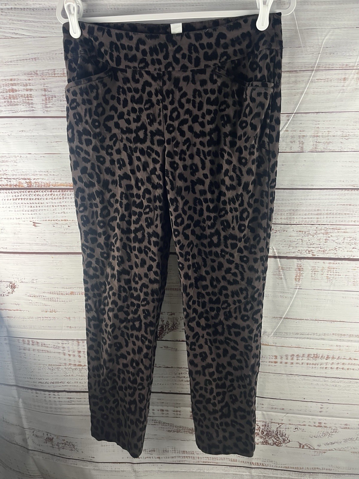 The Chico's Ankle Pants are a stylish and comfortable option for women looking to add some animal print to their wardrobe. These pull-on knit pants feature a stretch fabric in a black/brown color, making them versatile and easy to wear. The ankle length adds a trendy touch, perfect for pairing with your favorite tops and shoes. The sleek design and convenient closure make these pants a practical and fashionable choice for everyday wear.