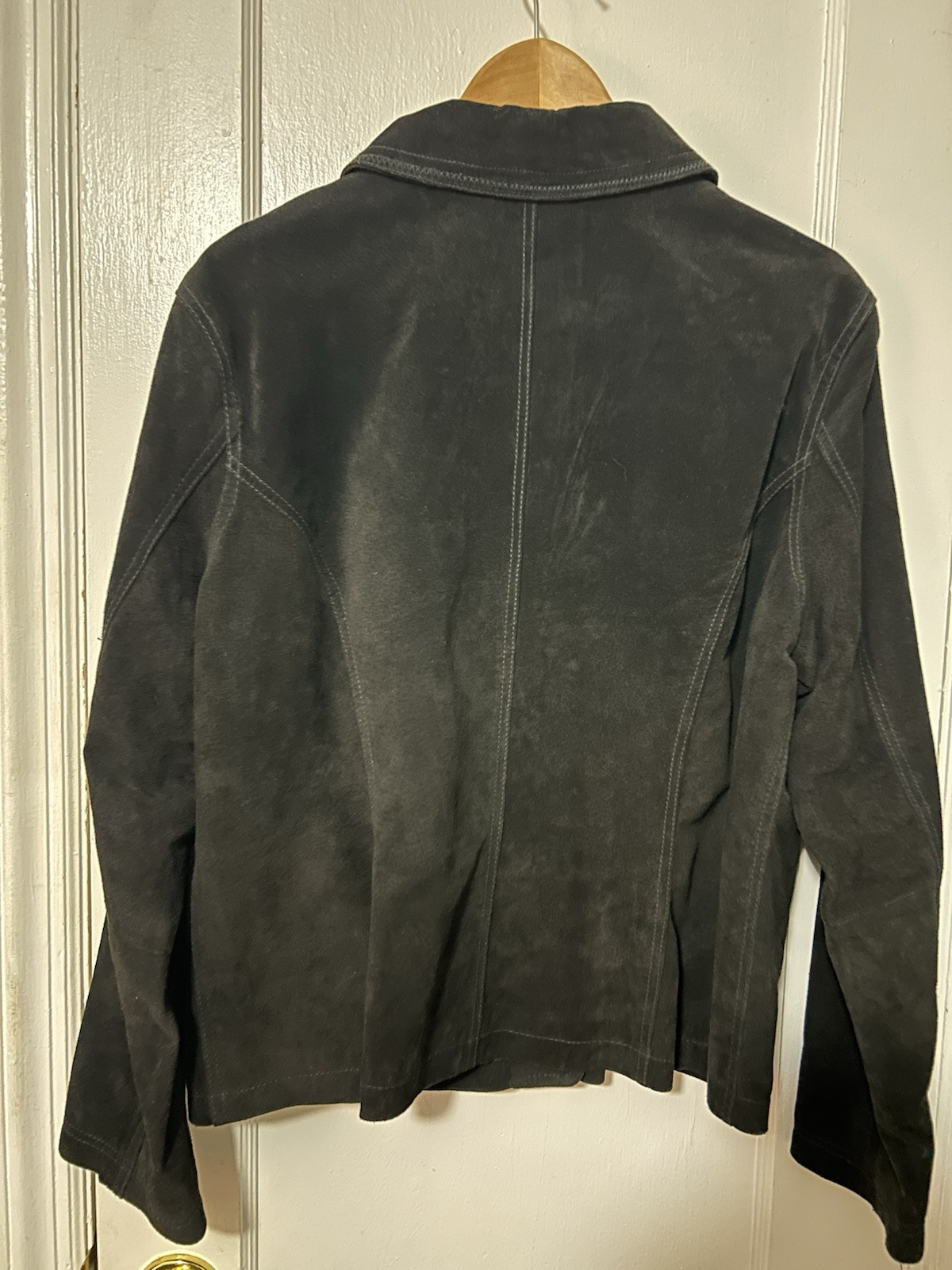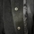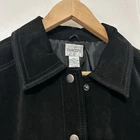 Chico's Black Suede Jacket in size 2 features a snap closure, pockets, and a classic fit. The jacket is made of leather with a polyester lining and insulation. It is designed with a long sleeve and a solid pattern, suitable for travel, casual, or business occasions. The jacket has accents like lining, zipper, and pockets, adding functionality. The style is a basic jacket, with a timeless classic theme.