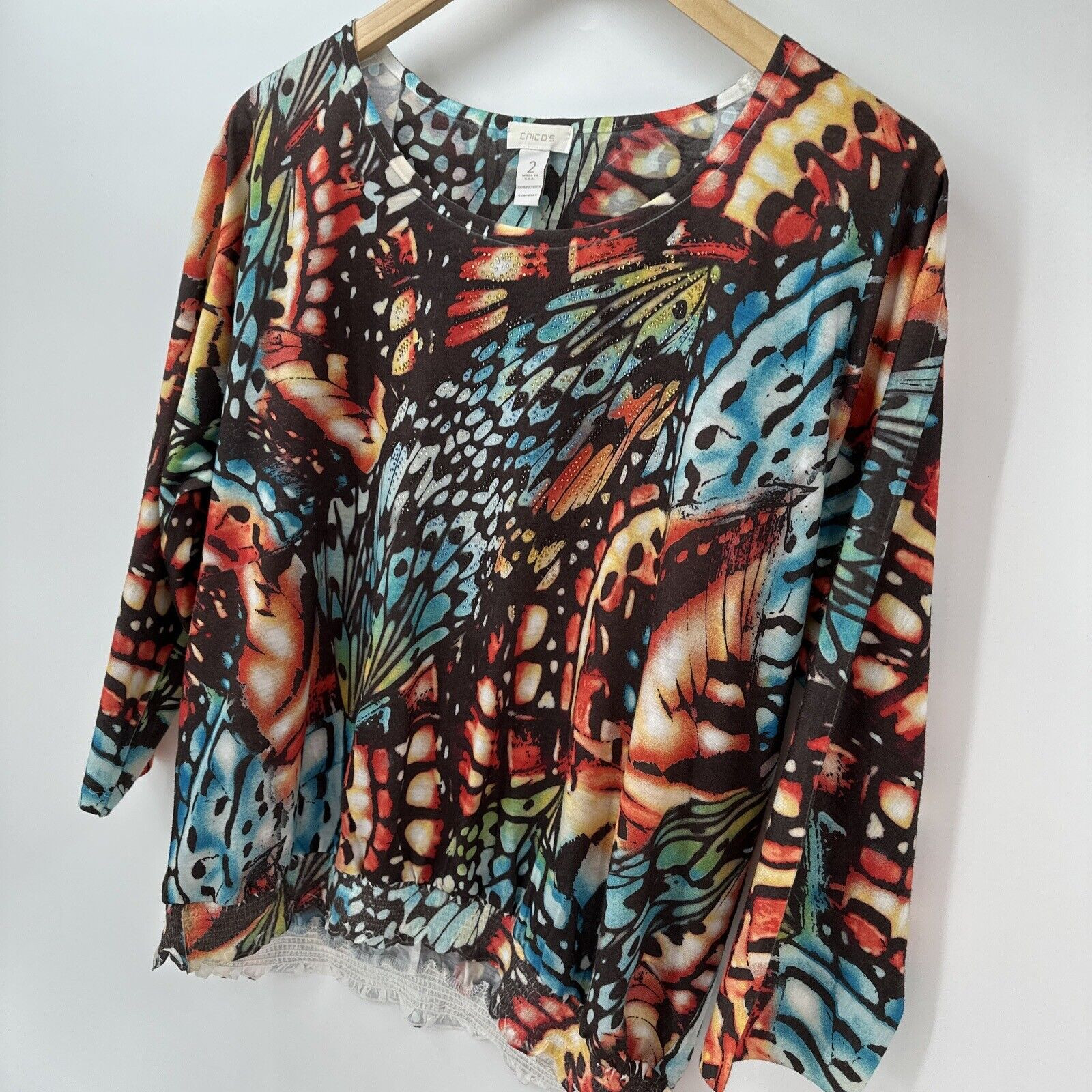 Chico's Women's Blouse Size 2 (Large) Butterfly Themed Beaded Pullover Art to Wear 3/4 Sleeves Elastic Waist Artsy Boho Very good condition, see all pictures for views. * Pit to pit: 23" * Shoulder to hem: 24" Ships out same day or next open postal day. Thank you for your purchase, we appreciate you!