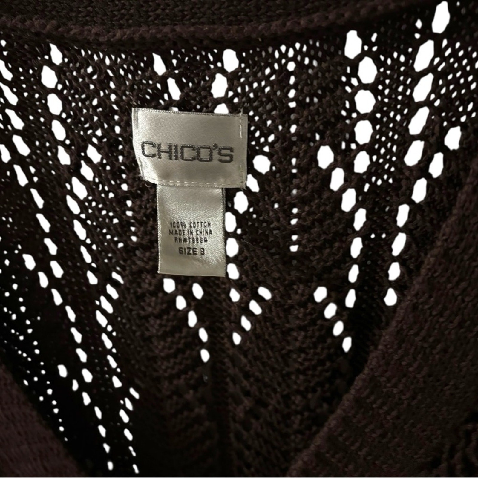 Chico's V-neck sweater in deep brown. Features a textured knit design. Ideal for layering. 22” ptp full length 30”