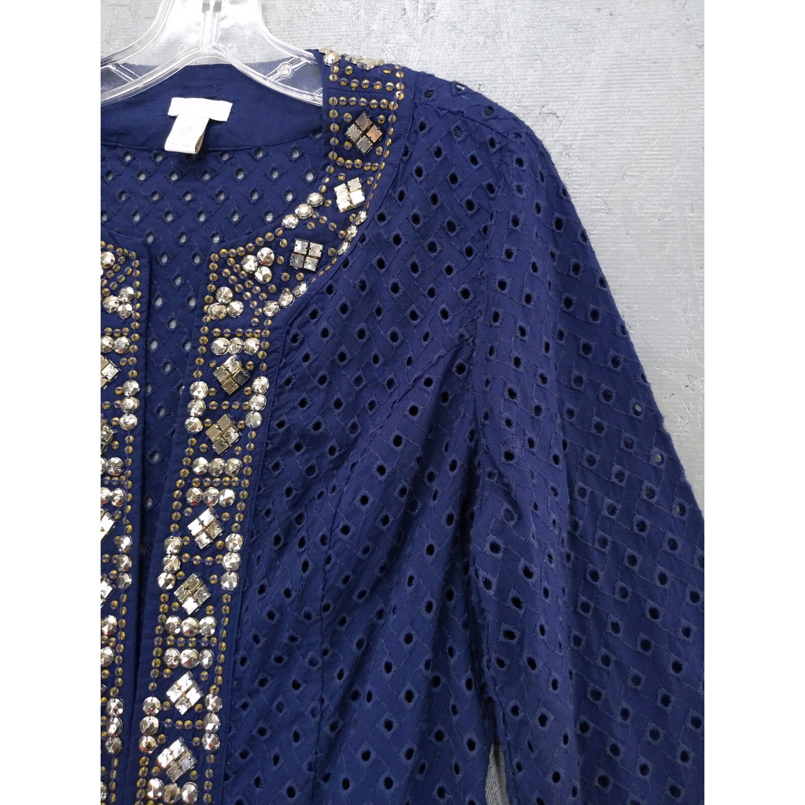 Elegant open-front jacket from Chico's, featuring a sophisticated navy blue eyelet design. This stylish piece is adorned with intricate gold and silver embellishments along the neckline, front opening, and cuffs, adding a touch of glamour to the classic silhouette. The jacket has 3/4 sleeves and a comfortable, lightweight feel, perfect for layering. Measurements: * Chest Across: 19 inches * Shoulder to Hem: 21 inches Excellent condition with no damage, stains, or significant wear.