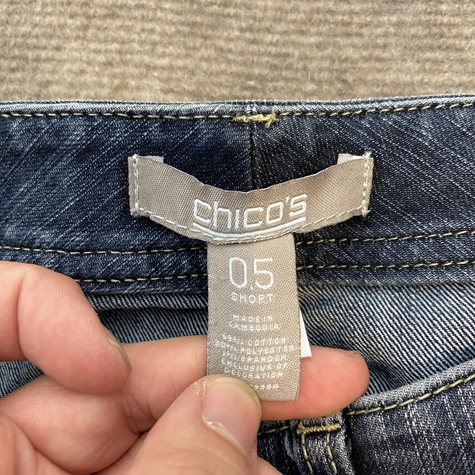 Gently worn with light overall wash fading and normal fabric wear. Very slight fraying at some belt loops and along hems. Zipper and button function properly. Brand: Chico's Style: Womens high-rise wide-leg jeans in a medium blue wash denim, Chico's size 0.5 Short. Color: Medium blue wash with subtle vertical streaking. Materials: Cotton, polyester and spandex blend denim (per tag). Details: Five-pocket design, embroidered back pockets, zip fly with button closure, belt loops, contrast stitching, wide leg silhouette, short inseam length, comfortable stretch fabric. Made in Cambodia.