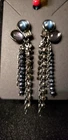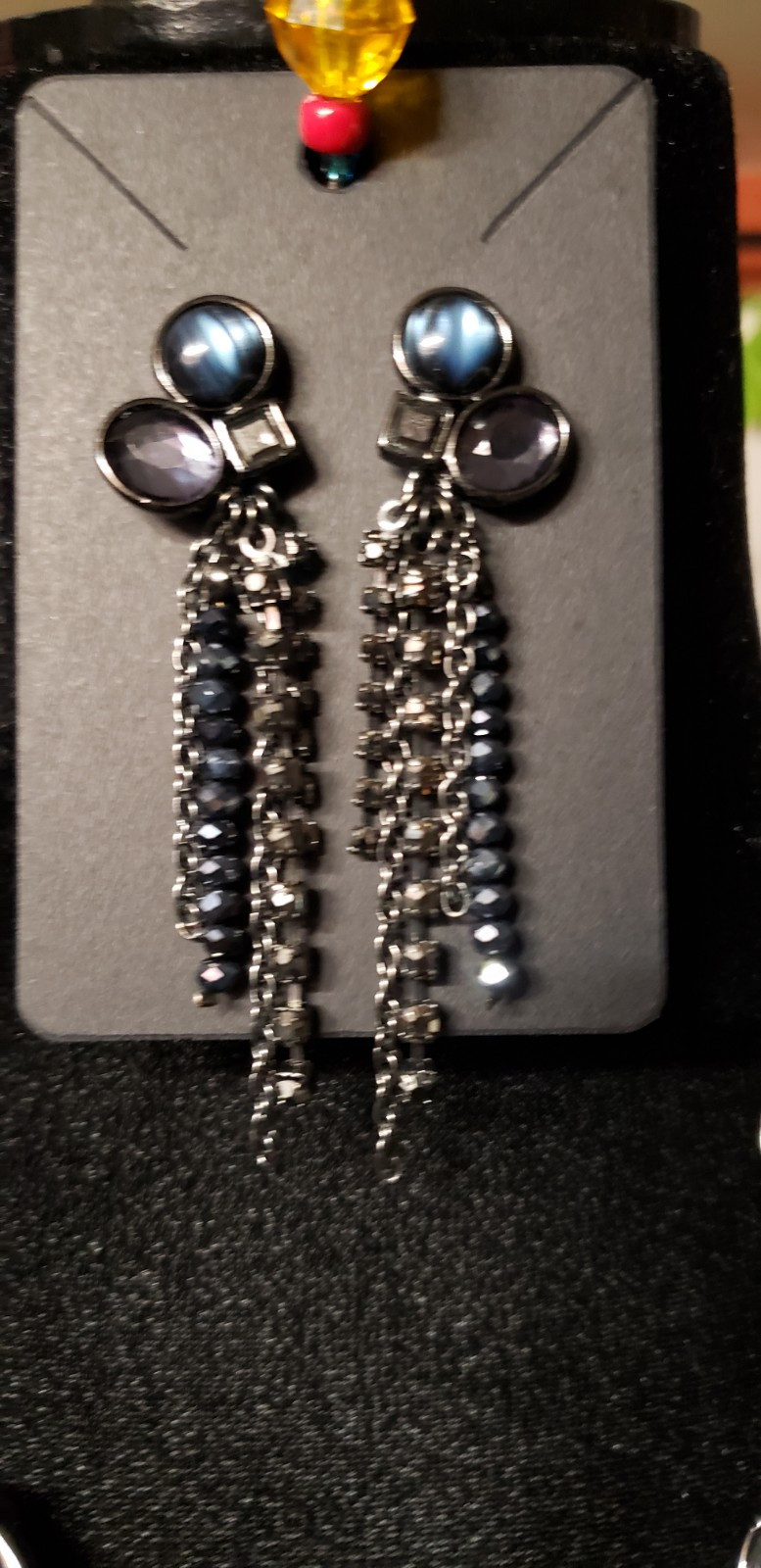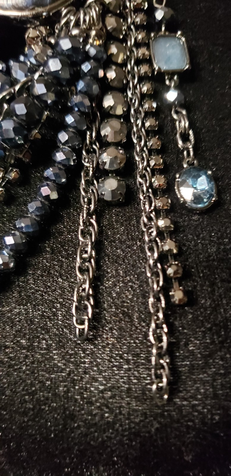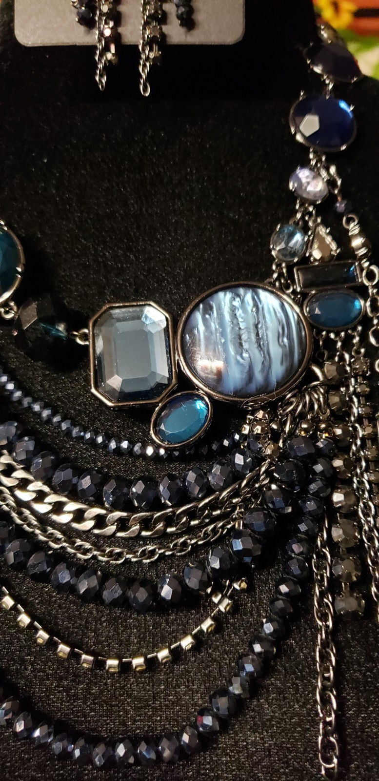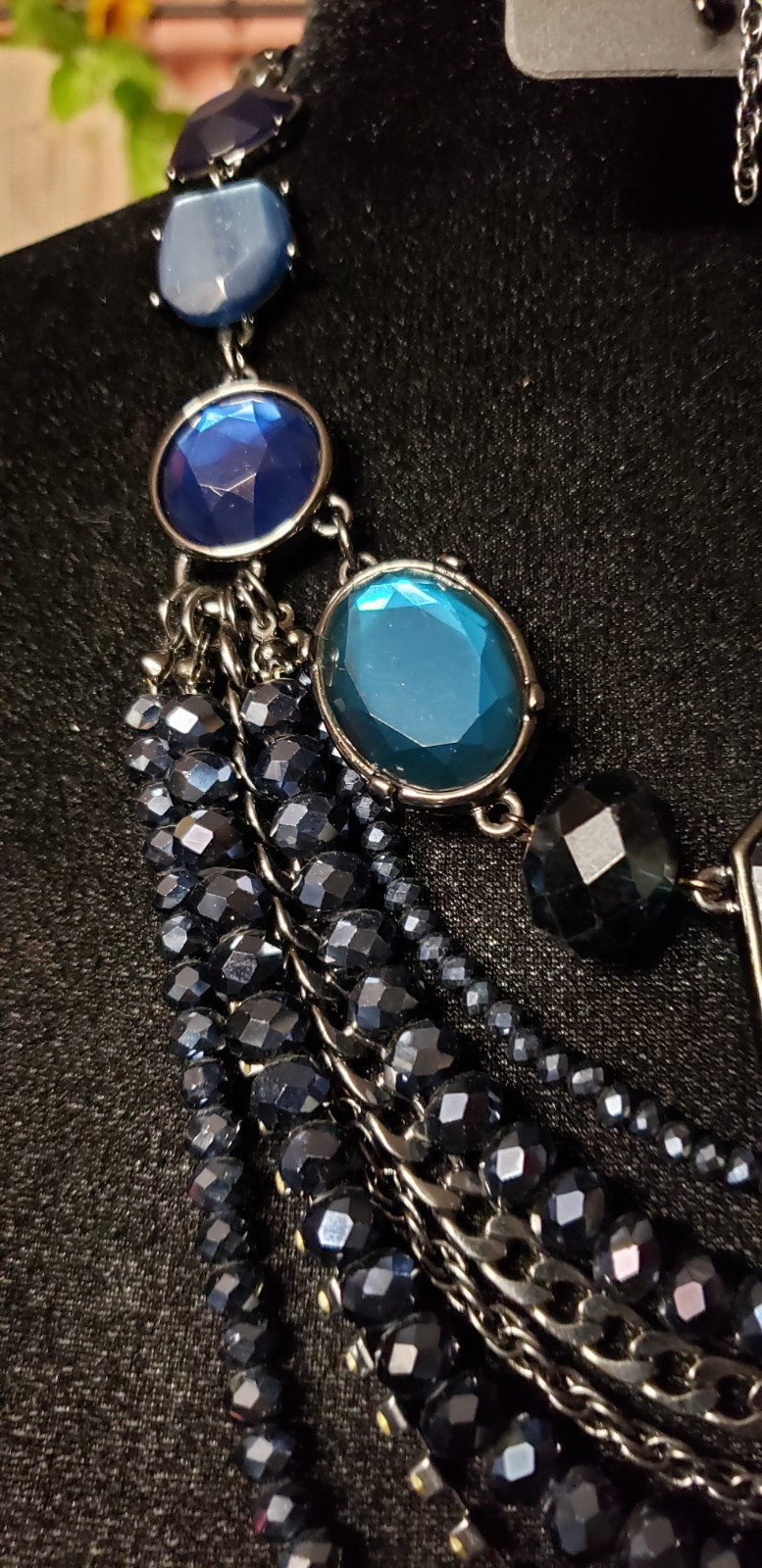 This Chico's Midnight Blue Sparkle Bib Necklace & Matching Earring Set features an asymmetrical bib adorned with faux sapphires in shades of navy blues complimented with hematite colored metal. The necklace is 12 inches long, a 3 inch extension chain, and a lobster closure. This high fashion jewelry set includes a coordinating 3 inch earrings, both signed by Chico's, making it a glamorous choice for occasions like Mother's Day, weddings, birthdays, and more. Perfect for those who appreciate statement pieces with a touch of sparkle and sophistication. Thank you for looking. Please take a look at my other great listings!