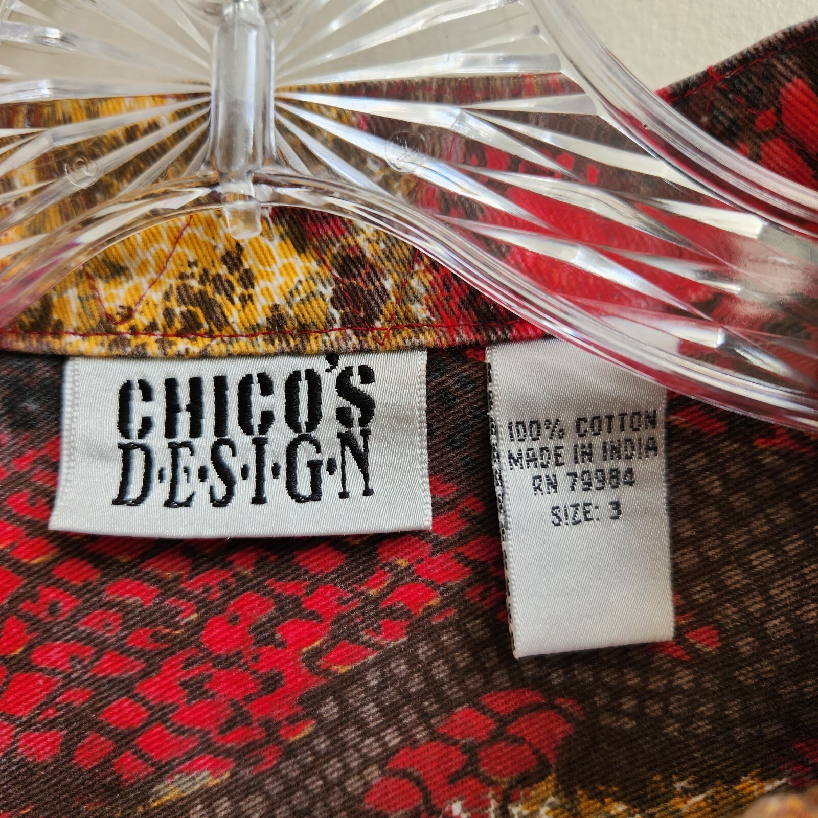 Chico's Design Jacket Womens 3 Red Leopard Print Denim Southwestern Santafe Chic - Pre-Owned in Very Good Condition - Measurement – Approximate Shoulder to Shoulder - 17 3/4 in Chest Armpit to Armpit - 22 3/4 in Arm Length - 23 1/4 in Length – 24 1/2 in - Red, Brown, Gold, & Black Animal Print Long Sleeve Denim Jacket. 100% Cotton - Any Season, Night Out, Vacation, Resort Wear, College, School, Everyday, Day Out, Shopping, Party, Stylish, Chic, Trendy, Casual, Festive and Simple - Returns acceptable within 30 days of purchase unworn, in original condition - Check out my E-bay Store. Lots of Choices Available. Reduced shipping for 2 or more items. Let me know before you pay so I can send you an invoice to discount the shipping