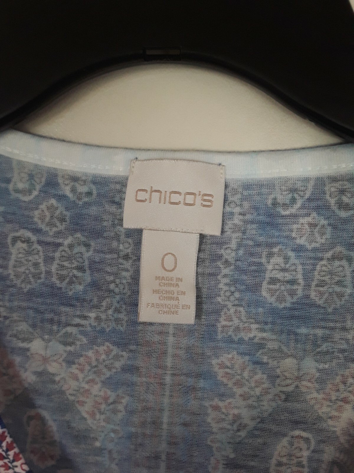 Chico`s Studded Embellished Top Sz 0 Armpit-armpit: 19" Length: 23" AT Combined Shipment: USA : Highest item shipping cost + $3.00. for each subsequent item.Or, you can purchase as many items as you choose and pay the flat rate of $ for your Priority Mail Large Flat Rate Box which covers your entire order. Please read the disclaimer below. INTERNATIONAL SHIPMENTS: Highest item shipping cost {+ Item weight.} for each subsequent item. Please read the disclaimer below. DISCLAIMER on Shipping Costs: Our intention is to keep our shipping costs as low as possible. However, depending on the item purchased (weight) and the destination, shipping rates can vary; especially 30 Day?s No Questions Asked Returns Policy: Your satisfaction is very important to us. We have a 30 days NO QUESTIONS ASKED returns policy. The item must be returned in the condition in which it was purchased. If there are labels/tags they should not be removed. If they are, the item will be sent back to you. ANY SHIPPING COSTS WILL NOT BE REFUNDED. BOTH WAYS, receiving and any returns. Please contact us for the return shipping address and authorization. ALL COMMUNICATIONS MUST BE IN WRITING & TAKE PLACE THROUGH THE EBAY SITE ONLY. No private direct email correspondence. A customer care rep. will respond to you within 24 hrs (Mon-Fri). Once we have received the merchandise and inspected it, please allow 72 hours for a refund to be issued. NO See my other listings for more great items! We accept PAYPAL. Also we have a virtual terminal with PayPal through which we can accept Visa, MasterCard, Amex, and Discover. If you do not have a PayPal account, it takes virtually minutes to open International shipments: PLEASE DO NOT PAY until we determine your shipping costs. Most of our items also have an International Flat-Rate. Although, if due to the destination or the weight we are unable to honor the rate mentioned in the item?s listing, we will cancel your order and leave you positive feedback. Usually we use the US Postal Service. The best international rate for an international shipment is First Class (up to 4 lbs.)If your items exceed 4 lbs. we may pack them into two separate packages (and notify you of this).You still are eligible to take advantage of the combined shipping rates, even if we have packed them into two separate packages. The fees for packaging, shipping, insurance, Customs Duty Charges on international shipments are all the responsibility of the Buyer and are not included in the purchase price. If the item(s) are gifts, we could indicate ?GIFT? on the customs form so you would avoid paying more on duty.
