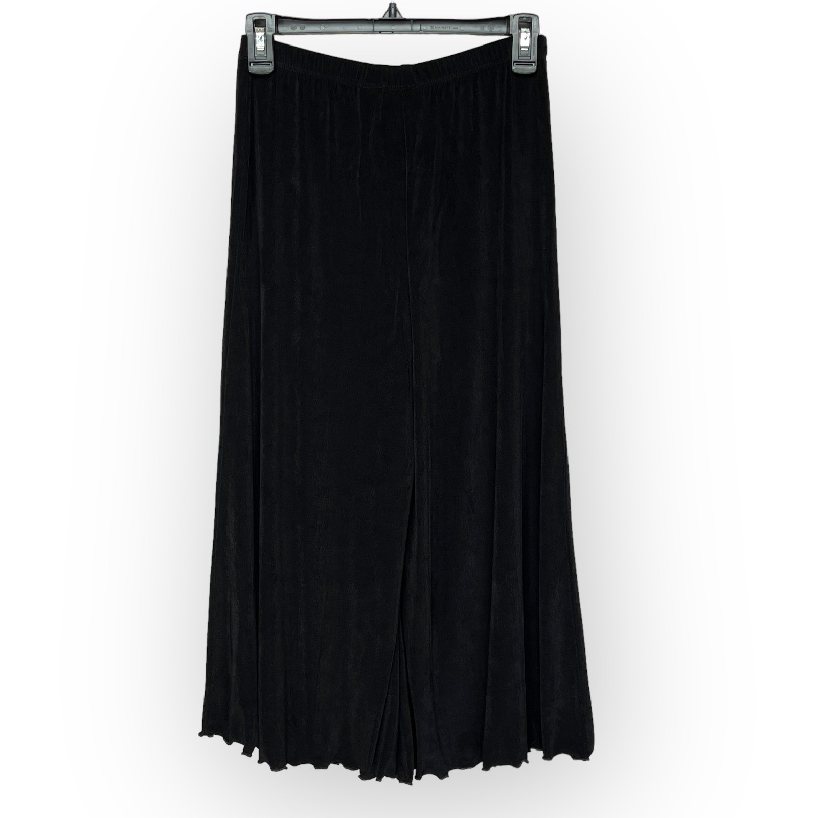 Chico's Travelers black palazzo pants. These wide leg cropped pants feature a comfortable elastic waistband and a playful lettuce hem. The fluid silhouette and soft fabric make them perfect for relaxed everyday wear or travel. Style: Cropped Department: Women Material: Spandex, Acetate Leg Style: Flared Type: Pants Fabric Type: Knit Features: Stretch, Elastic Waist, Lightweight Closure: Pull On Pattern: Solid Accents: Ruffle Occasion: Casual, Travel Fit: Relaxed Rise: Mid (8.5-10.5 in) Front Type: Flat Front Keywords: palazzo, gaucho, cropped, flare, lettuce hem, wide leg, travel pants, elastic waist, flowy, comfortable, casual, resortwear, black pants