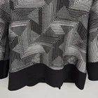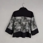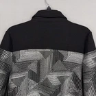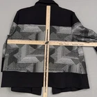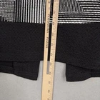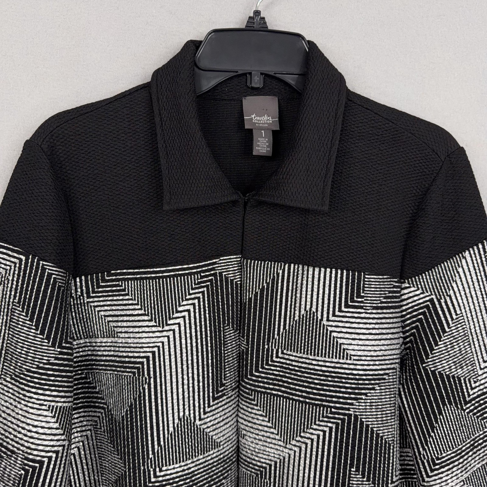 Chicos Travelers Jacket Womens 1 Black Silver Geometric Textured Knit Open Front Previously worn with minimal signs of wear. No obvious stains, snags, or holes seen on inspection. Fabric, metallic pattern, and closures are intact and in good working order. Brand: Travelers Collection by Chico's Style: Womens knit jacket with a collared neckline and swing silhouette, featuring wide 3/4 bell sleeves and an open front with small hook-and-eye closures near the neckline. Color: Black with metallic silver geometric stripe pattern across the body and sleeves. Material: Shell/body 97% polyester, 3% spandex, exclusive of decoration (per interior fabric tag). Size on tag: 1 (Chico's sizing; womens). Style/Model codes on inner tag: 401887244, 57129690, 07/25/2018, 806958. Details: Textured stretch knit fabric, unlined, banded hem and sleeve cuffs, modern geometric design with metallic sheen, easy-care travel-friendly fabric typical of the Travelers collection. 22721 Measurements: - Previous washings may change the sizing written on the tag. - Please refer to the photos above for all measurements. - Please compare our measurements to that of one of your favorite garments. - Please note, item measurements are approximate . All items are bagged and sealed after being photographed, then stored in a smoke free environment to ensure the item is exactly the same as when photographed. All items have been washed per eBay standards & policies. I carefully package and ship daily. Feel free to contact me with any questions.