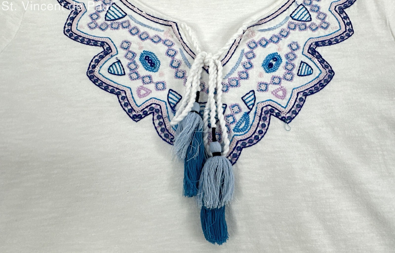 This top is absolutely stunning! The delicate embroidery and tassel neckline add such a chic, boho touch. The fit is perfect—flattering and comfortable—and the white color makes it so versatile. It looks brand new, no signs of wear at all. A must-have for any wardrobe!