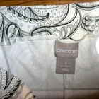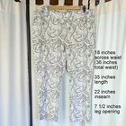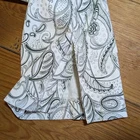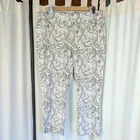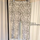 Chicos Womens Crop Stretch Pants Size 3 (Large) Gently used. Color is greenish/gray (looks more gray in the photos) Paisley pattern on a greenish/gray stretch pants. These high-rise pants have a straight leg style with side slits and pockets. Classic, coastal, tropical look. Made from a blend of rayon, cotton, and spandex Very comfortable while looking great. Size 3 (Large) 18 inches across waist (36 inch waist total) 35 inch length 22 inch inseam 7 1/2 inch leg opening