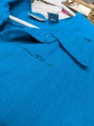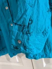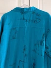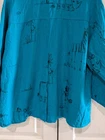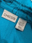 Chico's women's button down collared shirt in a blue animal print, size 2, made from 100% linen. Features three-quarter sleeves, mother of pearl buttons, and an artsy, breathable design. Pre-owned with a blemish on the front as shown in photo. Measures approximately 23" armpit to armpit, 24" from center back of neck to hem, and 17" sleeve length from shoulder seam to cuff. CB Treasures ships same day / next day! All items are stored in a clean, smoke-free, and dog-free environment and are carefully packed to guarantee their safe arrival to you. With pre-owned clothing, sizes may vary due to alterations, brand differences, and previous care, so please refer to the provided measurements along with the size tag to ensure the best fit.