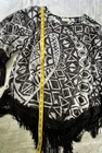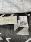 The Chico's Women's Blue Top Blouse is a stylish and versatile piece perfect for travel or casual occasions. This geometric pattern blouse features a round neck, 1/2 sleeves with fringe accents, and a pullover closure. Made from 100% polyester, this multicolor blouse is designed with a sheer black and white fabric with tassels, adding a unique touch to the classic design. The hip-length blouse in size 2 offers a regular fit for comfortable wear during the summer, fall, or spring seasons.
