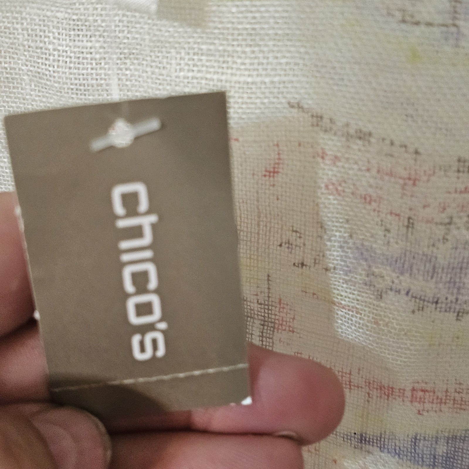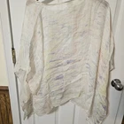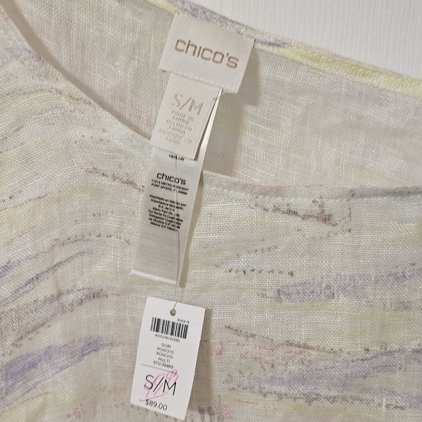 The Chico's Women's Dori Poncho Popover Top in size S/M is a colorful and lightweight linen blouse perfect for travel and casual occasions. Featuring a boat neckline, kimono sleeves, and a pullover closure, this relaxed-fit top is ideal for a beachy, tropical look. Hand wash only to care for this breathable and oversized garment that is sure to make a statement with its vibrant multicolor design. Perfect for adding a touch of whimsy and fairy-like charm to your wardrobe, this Chico's top is a stylish and comfortable choice for any woman on the go.