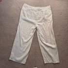 In the quiet corners of a summer garden, these linen pants find their essence. Crafted by Chico's, they whisper tales of comfort and style. With a gentle beige hue, they promise airy elegance, keeping you cool under the sun's embrace. Their wide-leg design invites freedom, perfect for leisurely strolls. • Wide leg design • Button detail on waistband • Two side pockets • Breathable linen material • Made in China Top to bottom = 35.75 inches Waist = 16.5 inches
