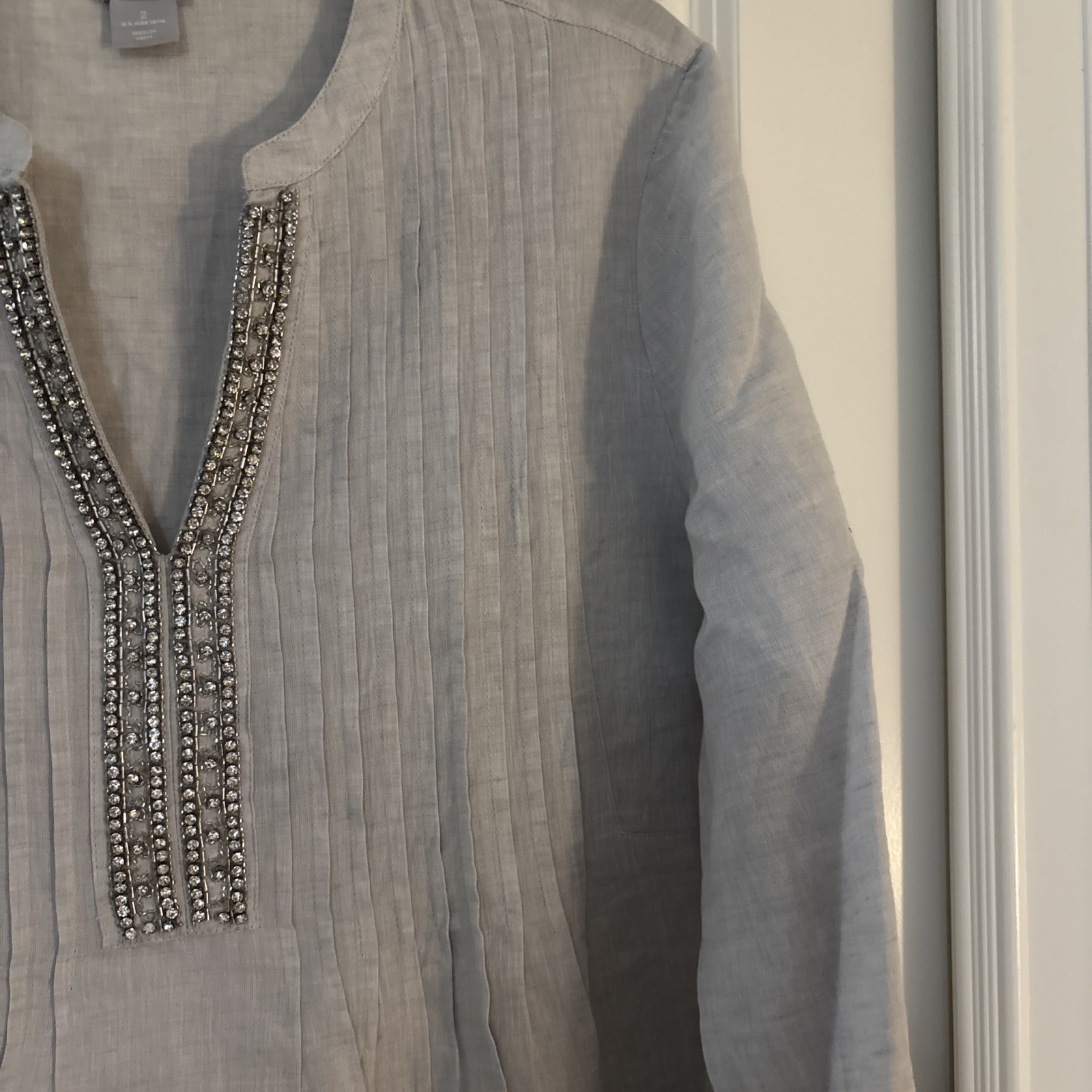 This Chico's Women's Long Sleeve Tunic Top in size 2 features a stylish V-neck design with rhinestone accents for a touch of glamour. Made from a comfortable linen blend material, this gray top is perfect for casual occasions during any season. The pullover closure and regular fit make it easy to wear and effortlessly chic. Machine washable for easy care, this tunic is a versatile addition to any wardrobe.