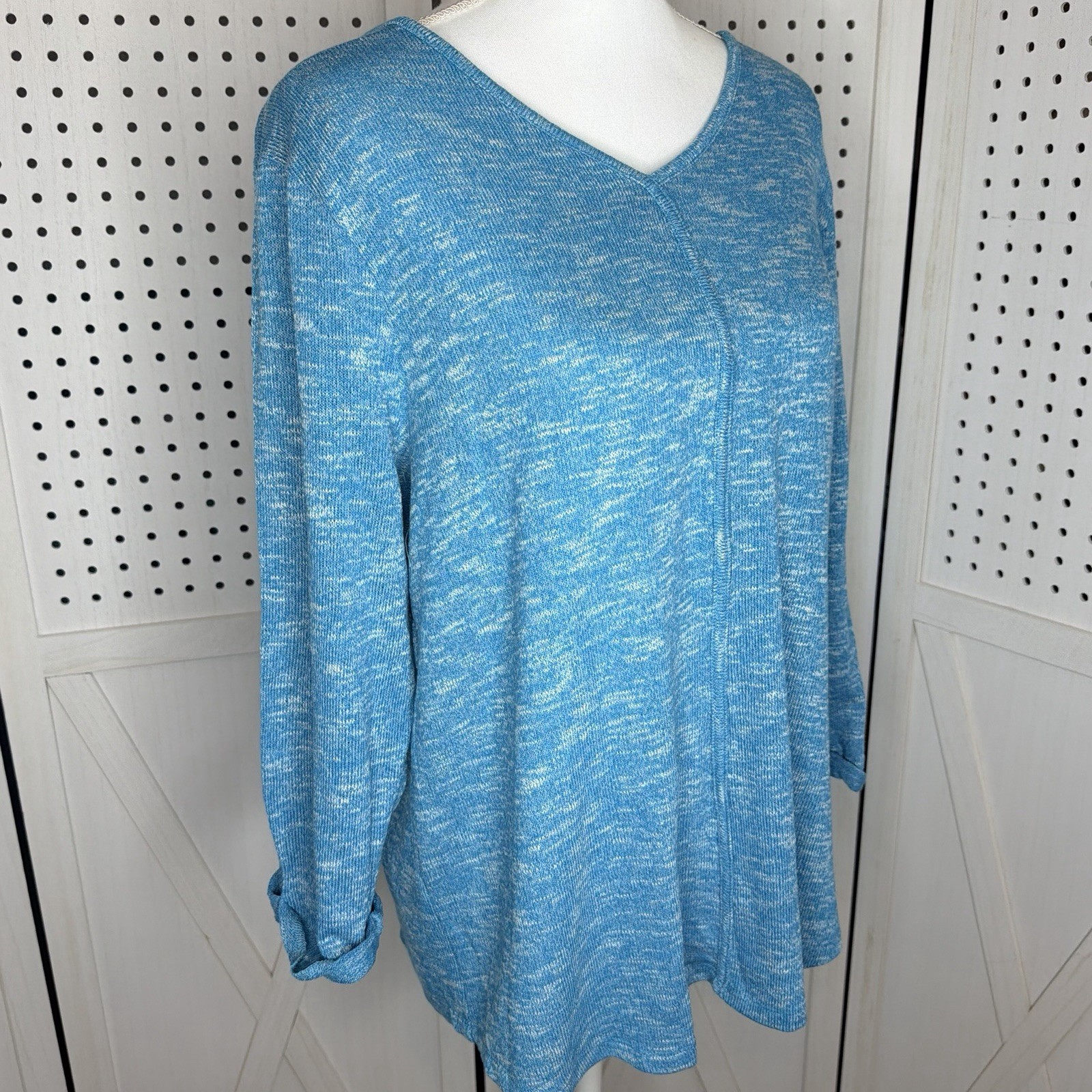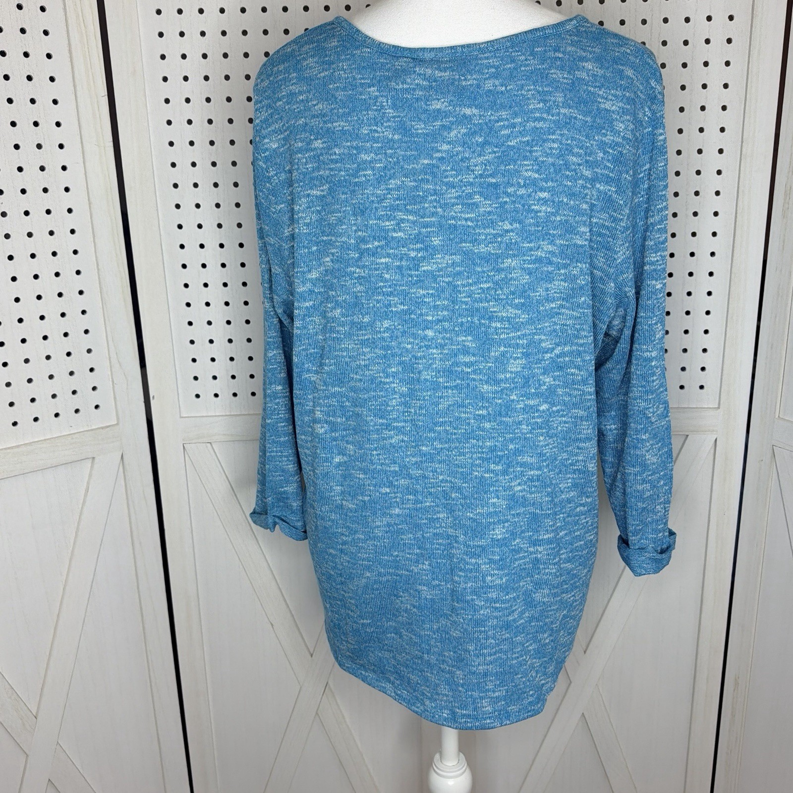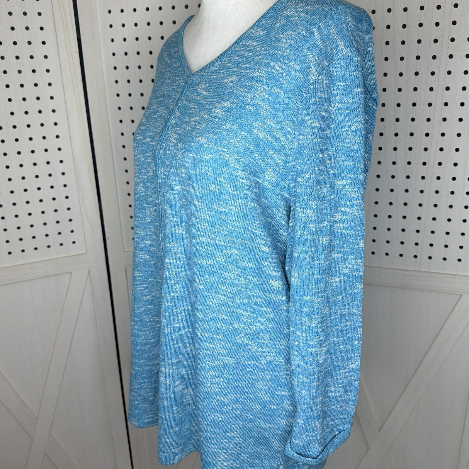 Soft and easy to wear, this beautiful blue marled knit tunic from Chico’s is perfect for casual everyday style. The lightweight fabric drapes nicely and features a flattering V-neckline with a relaxed silhouette for comfortable wear. The longer tunic length makes it great to pair with jeans, leggings, or slim pants. Features: • Soft lightweight marled knit fabric • Flattering V-neckline • Relaxed, flowy tunic silhouette • Long sleeves • Easy everyday casual style Size: Chico’s 3 (approximately XL / 16–18) Pit to pit-24 Length-29