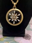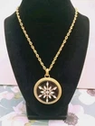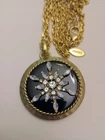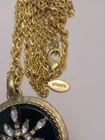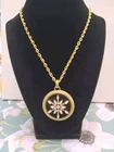 Add some sparkle to your outfit with this beautiful Chico's gold tone chain necklace. The round pendant has shining rhinestone flower and the lobster closure ensures a secure fit. The necklace is perfect for formal occasions or adding a touch of glamour to your everyday look. The pendant black and gold color adds a stylish and unique touch to the necklace, making it a must-have accessory for any jewelry collection. I153/12
