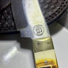 The Chipaway Cutlery Creosote Bush Bowie Knife features a stainless steel blade with a plain edge and a full tang for strength. The handle is made of bone and wood, providing a secure grip. This ambidextrous knife comes with a leather sheath for safe storage and transport. With a blade length between 4.1 to 5 inches, this collectible fixed blade knife is both functional and visually appealing.