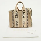 This beautifully stitched tote in canvas and leather is by Chloe. With a capacious interior, it will safely house your work or travel essentials. The functional bag is complete with dual handles and gold tone hardware.Certified by The Luxury Closet - This item has gone through a detailed authentication process overseen by our experts. We offer a lifetime guarantee of authenticity on all our items. Import duties, taxes and charges are not included in the item price. These charges are the buyers responsibility. Please check with your country’s customs office to determine what these additional cost will be prior to buying. Our eBay Store About Us Contact Us Add to Favorite Sellers Chloe Beige Canvas Small Woody Tote $609.4 This beautifully stitched tote in canvas and leather is by Chloe. With a capacious interior, it will safely house your work or travel essentials. The functional bag is complete with dual handles and gold tone hardware. Product Details Brand Color Beige Dimensions Height: 20 cm, Width: 8 cm, Length: 26.5 cm Material Canvas Size Medium Outsole Width Outsole Length Heel Height Includes Original Dustbag, Info Booklet, Authenticity Card, Detachable Strap Certified by The Luxury Closet This item has gone through a detailed authentication process overseen by our experts. We offer a lifetime guarantee of authenticity on all our items. How We Check The in-house team of experts at The Luxury Closet is highly trained to verify the authenticity and the condition of the luxury products. They ensure that only 100% authentic items are put on sale.The evaluation process is unique with its own mix of assessment criteria and differs according to the category. Each item is evaluated based on the following combination of hallmarks, hardware, stitching, symmetry, material, craftsmanship, stamping, codes, hologram stickers, and packaging. Our authenticators also check if the items have been modified or amended (e.g., aftermarket diamonds, replaced batteries, repaired bags, etc.) International Buyers Import duties, taxes and charges are not included in the item price. These charges are the buyers responsibility. Please check with your country’s customs office to determine what these additional cost will be prior to buying.