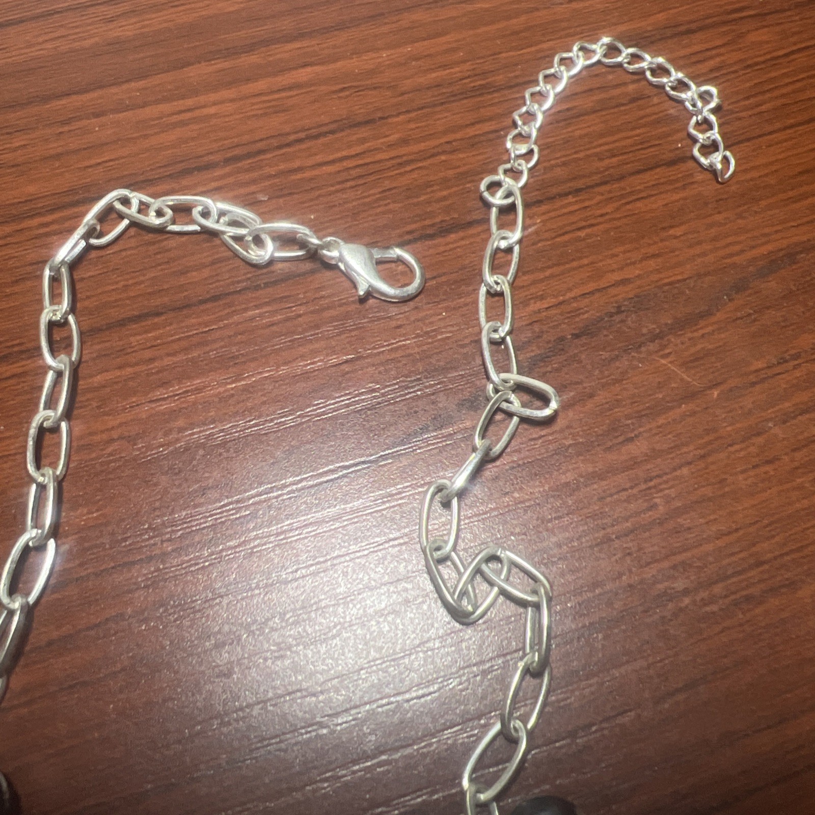 The Choker Necklace is a stylish accessory featuring a silver tone chain with large black beads that dangle from it, creating a bib-like design. The combination of the black beads and silver metal adds a touch of edgy sophistication to any outfit. Perfect for those looking to make a statement with their jewelry, this necklace is a bold and eye-catching piece that can elevate any look.