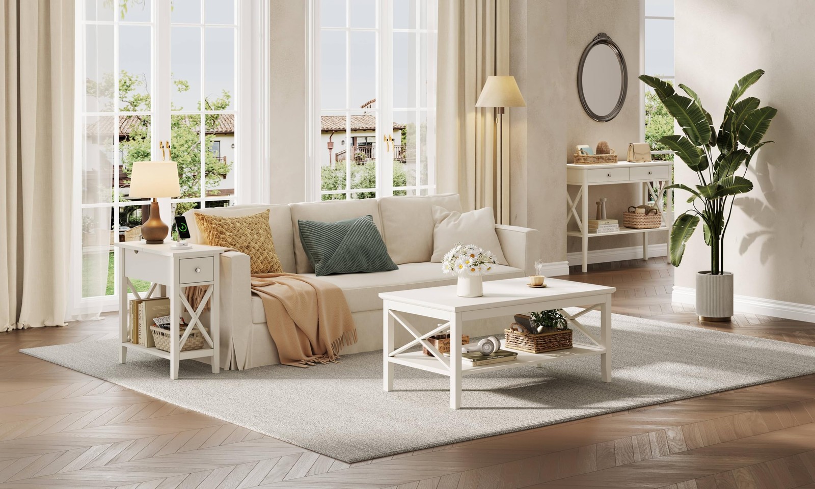 Product Description: The design of our white end table with X-frame is a blend of Modern Furniture Trends & Vintage Traditionalism. It has smooth surface and fluent line, so it is easy to clean and maintain. Charging station includes two standard outlets and two USB ports which can easily charge your phone and tablet. The 6.5ft Long power supply cord enables you to display your end table where you choose. Open shelf and drawer design on desktop increase storage space and can hide away odds and ends. Features : - Size:23.6"L * 11.2"W * 24"H - Net Weight: 23.6 lb - Material: P2 Grade MDF board - Assembly required: Yes - Hardwares included: Yes - Finish and Color: Paint, Espresso - Assembly time: 0.5 hour Package Includes: - All parts - Hardware - Assembly instruction 【Unique Design】The narrow sofa side table with flip top open design and X shaped profile, Classic color matching is easy to integrate with your furniture. Bring different visual experience for your living room. 【Versatile Space Save】This narrow end table features open shelf and drawer for storing small things like remote controllers, snacks and so on. 【Recessed Power Strip】The charging station features 2 standard plug outlets and 2 USB ports for which you can charge your electronics such as phone and Pad. Keep the power outlet within your arm’s reach. 【Guide For Assembly】Detailed instructions will guide the assembly step by step, the parts and accessories of our rectangular end table are numbered and easy to distinguish. 【Durability Materials】This flip top end table was crafted from high quality P2 Grade MDF board, which can be hold up wonderfully for years.