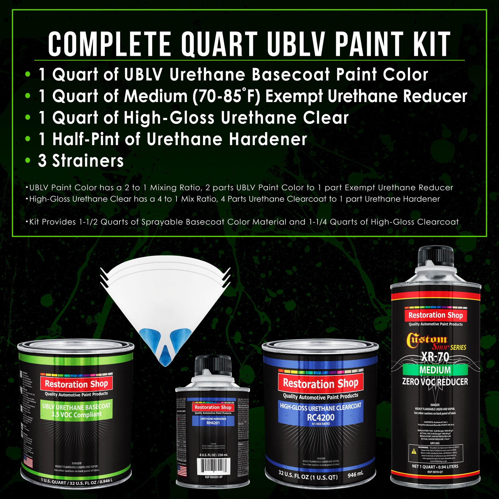 TCP Global Ebay Storefront Ordering | Shipping | Returns | International Product Information FLAMMABLE/HAZARDOUS ITEMS ARE SHIPPED VIA UPS GROUND/STANDARD TO THE LOWER 48 U.S. STATES & CANADA. ***SHIPPING VIA U.S. POSTAL SERVICE OR TO A P.O. BOX IS NOT AVAILABLE.*** RUSH AIR SHIPPING IS AVAILABLE IN CONTINENTAL U.S. FOR AN ADDITIONAL HAZMAT AIR SHIPPING CHARGE. CONTACT US PRIOR TO ORDERING FOR AIR SHIPPING QUOTE. IF ORDER IS PLACE FOR AIR SHIPPING YOU WILL BE CONTACTED FOR ADDITIONAL SHIPPING PAYMENT. INTERNATIONAL SHIPPING IS AVAILABLE. CONTACT US FOR SHIPPING QUOTE PRIOR TO ORDERING. Part# RSP UBLV2117-KIT-Q Chop Top Silver Metallic - LOW VOC Urethane Basecoat with Clearcoat Auto Paint (Complete Medium Quart Paint Kit) Professional Gloss Automotive Coating Complete 1 Quart Restoration Shop - Low 3.5 VOC Urethane Basecoat with Clearcoat Auto Paint Kit with Medium Drying Reducer (Used when the ambient temperature range is 70-85Á F). The kit provides 1-1/2 Quarts of sprayable basecoat color material and 1-1/4 Quarts of Premium Clearcoat. UBLV Paint Kit includes 1 Quart of UBLV Low VOC Urethane Basecoat Paint Color, 1 Quart of XR70 Exempt Medium Urethane Reducer, 1 Quart of RC4221 High-Gloss Urethane Clear, 1 Half-Pint of RH4201 Urethane Hardener and a 3 Pack of 190 Micron Nylon Automotive Strainers. The Restoration Shop (UBLV) Low VOC Urethane Basecoat and Premium Clearcoat System is a State-of-the-Art High-Performance Professional Easy-To-Use Paint Coating System that is Designed to Reproduce the Hi-Tech O.E.M. Automotive Finishes Found on Today's Vehicles. UBLV is an easy to spray fast-drying basecoat/clearcoat system that provides a long-lasting and very high gloss topcoat finish result. UBLV is an extremely durable, chemical and solvent resistant coating that also resists chipping, cracking, and UV ray fading. Restoration Shop's (UBLV) is a Low 3.5 VOC compliant basecoat/clearcoat paint system that may be used in National Rule or Low 3.5 VOC limit States when using it with the proper XR series reducers. Note: Monitors vary - onscreen colors are for general color reference only. Restoration Shop (UBLV) LOW VOC URETHANE BASECOAT with CLEARCOAT - COMPLETE MEDIUM QUART PAINT KIT Includes: 1 - Quart of Restoration Shop Low 3.5 VOC Premium Urethane Basecoat Auto Paint Color 1 - Quart of Medium (70-85¡ F) Exempt Urethane Reducer (RSP XR70-QT) 1 - Quart of High-Gloss Urethane Clear (RSP RC4221-QT) 1 - Half-Pint of Urethane Hardener (RSP RH4201-HP) 3 - Each Premium 190 Micron Nylon Automotive Strainers UBLV Paint Color has a 2 to 1 Mixing Ratio, 2 parts UBLV Paint Color to 1 part XR Urethane Reducer. UBVL Basecoat color requires a 2 to 1 mix ratio with the included medium drying (70-85¡ F) XR exempt urethane reducer before spraying. Restoration Shop High-Gloss Urethane Clear (RSP RC4221) has a 4 to 1 Mix Ratio, 4 parts Urethane Clearcoat to 1 part Urethane Hardener A 2.1 VOC conventional solid polyurethane clearcoat. A two-component (2K) polyurethane clearcoat formulated to offer ease of application, great flow and leveling, excellent durability and high-gloss. This high quality clearcoat is the prefered high production topcoat that professional's use in today's high-end auto body shops. This clearcoat is used for overall application, and is also used for spots and panels. The clearcoat is VOC compliant for all multi-stage topcoat systems, and can also be applied on top of other basecoat brands. Optional Reducers Available Separately XR Series Exempt Reducers to Maintain a 3.5 VOC Level: XR60 Exempt Fast Reducer 60-70¡ F; XR70 Exempt Medium Reducer 70-85¡ F; XR85 Exempt Slow Reducer 85¡ F and above Since 1974, Restoration Shop has been a Trusted Top Quality Brand and The Source for Innovative Premium Quality Automotive Products! Restoration Shop Low VOC UB Urethane Basecoat is a state-of-the-art basecoat designed to reproduce the hi-tech O.E.M. finishes found on today's vehicles. It features outstanding coverage, rapid dry time, excellent metallic control and optimum repairability. UBLV provides an environmentally friendly solvent solution. View all categories Warehouse Locations San Diego, California South Carolina