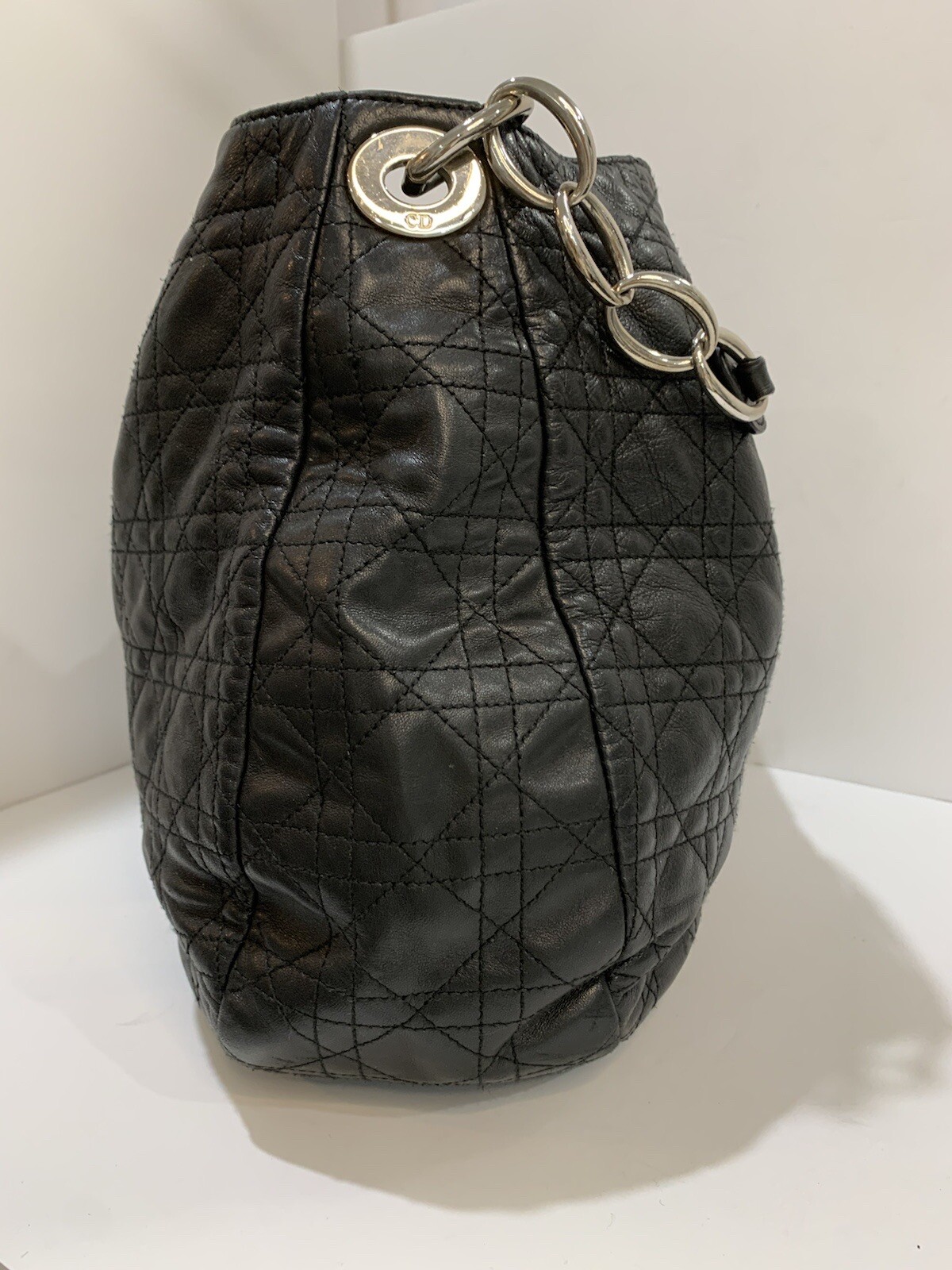 The Christian Dior Lady Dior Hobo Bag is a medium-sized rectangular/slouch style bag made of soft black lambskin leather. It features an internal magnetic clasp-closure and a black leather with silver chain strap with a 26cm drop. The bag has a quilted finish and a D.I.O.R letters charm accent. The iconic LADY DIOR Cannage quilting is in excellent condition and butter soft. The interior is lined in black and has 2 pockets for storage. One large zip closure, the other a small pocket perfect for keys. The bag is 44cm in width, 34cm in height, and 11cm in depth. It is a slouch design so the measurements are a guide. The bag is clean with slight wear. No scratches, no rubbing. Expected fine creasing to leather consistent with minimaluse - doesn’t detract from its excellent preloved condition. No dust bag or box Made in Italy. ***PLEASE SEE OTHER LISTING FOR MATCHING SMALLER PURSE!!!!! All my items are 100% authentic Please check out my other designer auctions to save postage.