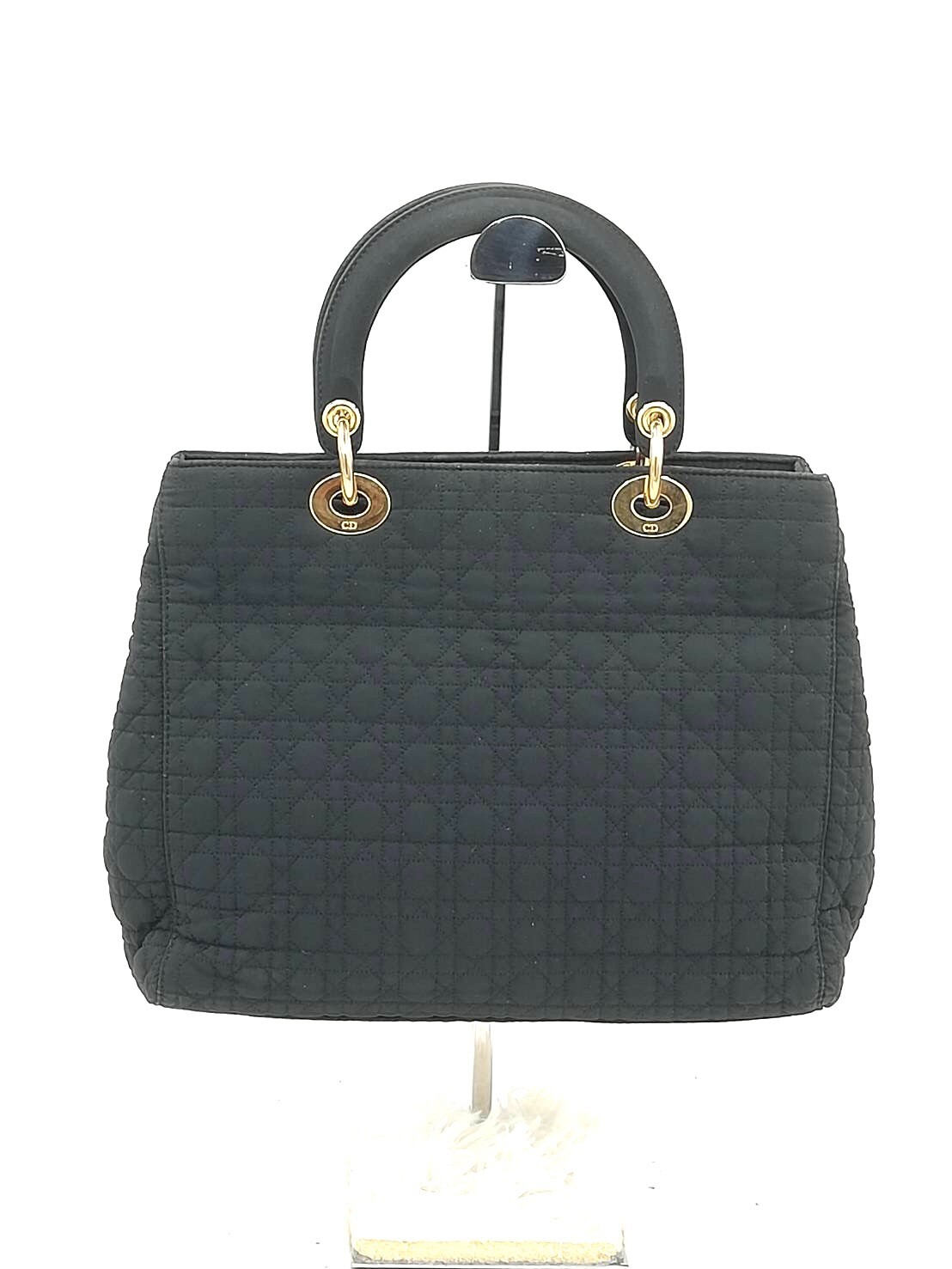 This vintage Lady Dior bag has a well-loved charm with its classic black cannage design. The canvas and leather show signs of wear, giving it a unique Y2K character. Despite scratches and stickiness, it holds up well for its age—spacious inside with a 25x30cm size. Perfect for those who adore authentic retro luxury without needing perfection!